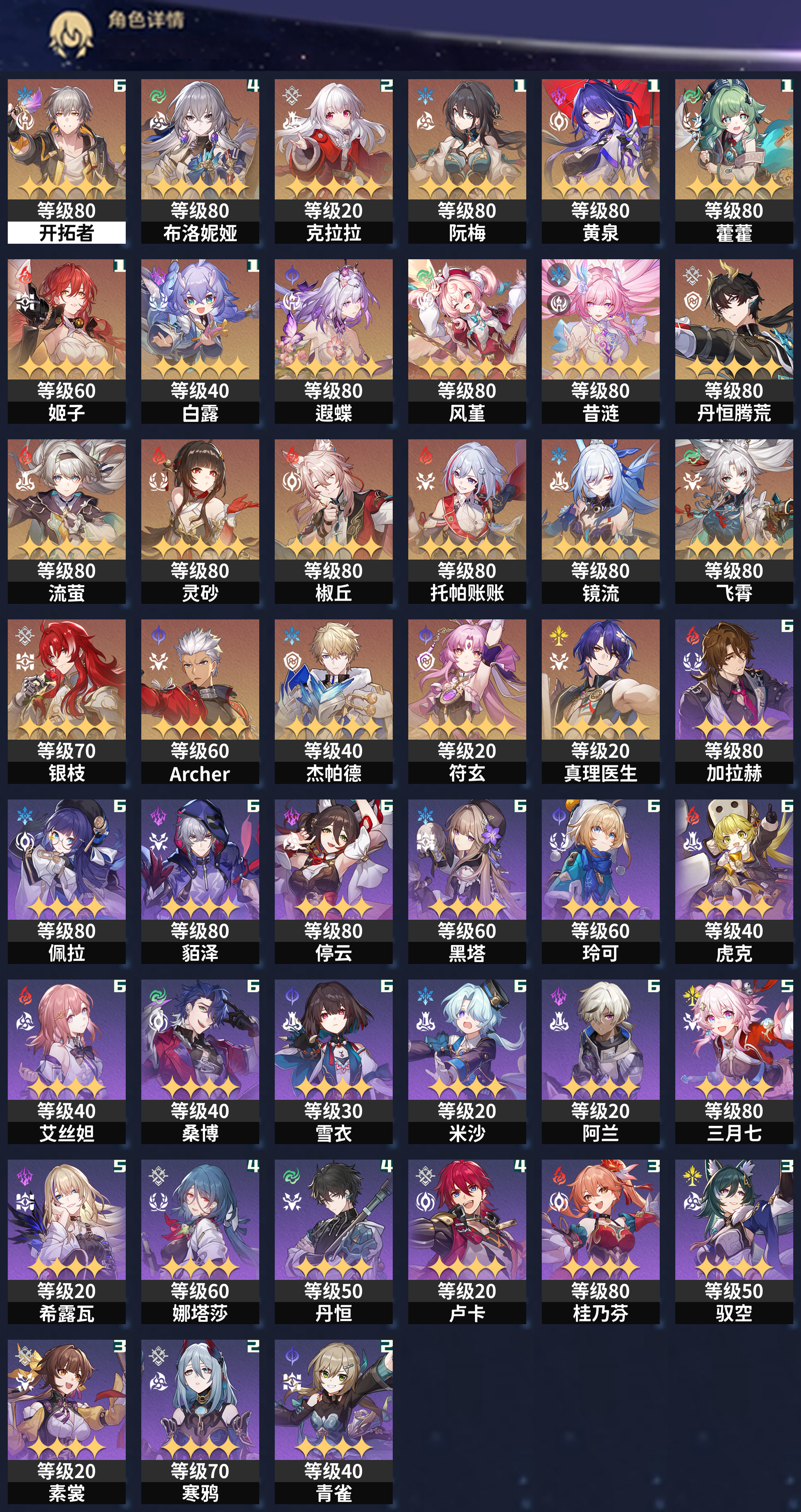 【崩坏·星穹铁道】【lyxq7259】冒险等级:70,男主,五星数量:35,绑定情况:手机号__五星角色:布洛妮娅 4命|克拉拉 2命|阮·梅 1命|黄泉 1命|藿藿 1命|姬子 1命|白露 1命|遐蝶|风堇|昔涟|丹恒·腾荒|流萤|灵砂|椒丘|托帕账账|镜流|飞霄|银枝|archer|杰帕德|符玄|真理医生__五星光锥:记忆永不落幕 4精|记一位星神的陨落|梦应归于何处|我将,巡征追猎|但战斗还未结束|行于流逝的岸|制胜的瞬间|唯有香如故|时节不居|愿虹光永驻天空|让告别,更美一些|银河铁道之夜|以世界之名,【邮箱未绑定】