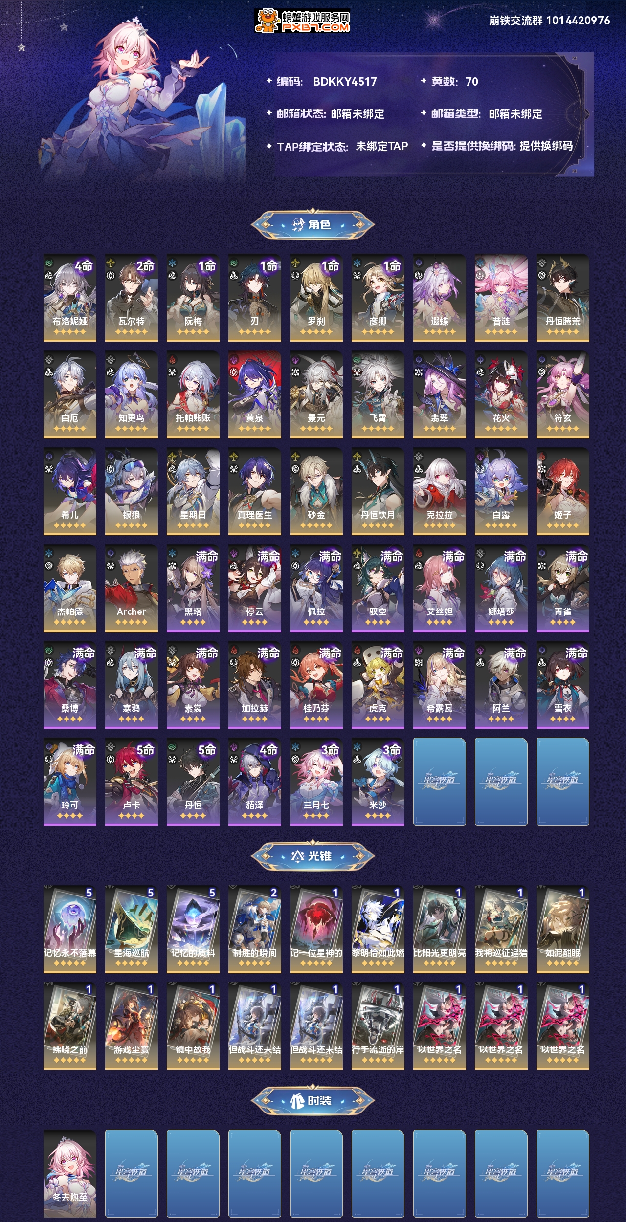 【崩坏·星穹铁道】【lyxq7263】冒险等级:70,男主,五星数量:44,绑定情况:手机号__五星角色:布洛妮娅 4命|瓦尔特 2命|阮·梅 1命|刃 1命|罗刹 1命|彦卿 1命|遐蝶|昔涟|丹恒·腾荒|白厄|知更鸟|托帕账账|黄泉|景元|飞霄|翡翠|花火|符玄|希儿|银狼|星期日|真理医生|砂金|丹恒·饮月|克拉拉|白露|姬子|杰帕德|archer__五星光锥:记忆永不落幕 5精|星海巡航 5精|记忆的质料 5精|制胜的瞬间 2精|记一位星神的陨落|黎明恰如此燃烧|比阳光更明亮的|我将,巡征追猎|如泥酣眠|拂晓之前|游戏尘寰|镜中故我|但战斗还未结束|行于流逝的岸|以世界之名,【邮箱未绑定】