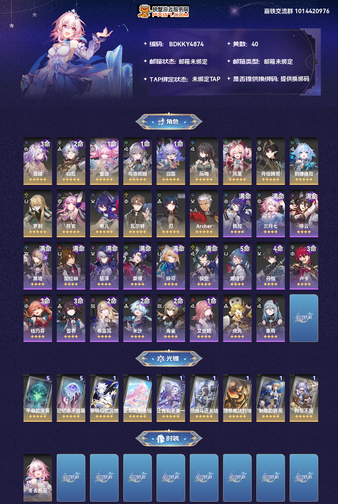 【崩坏·星穹铁道】【lyxq7284】冒险等级:70,女主,五星数量:24,绑定情况:手机号__五星角色:遐蝶 3命|白厄 2命|昔涟 1命|布洛妮娅 1命|白露 1命|阮·梅|风堇|丹恒·腾荒|刻律德菈|罗刹|符玄|希儿|瓦尔特|刃|archer__五星光锥:不息的演算 5精|记忆永不落幕 5精|黎明恰如此燃烧|爱如此刻永恒|让告别,更美一些|但战斗还未结束|理想燃烧的地狱|制胜的瞬间|时节不居,【邮箱未绑定】