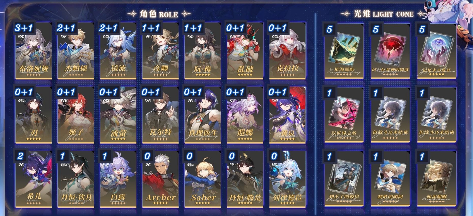[14100205]m24059,70级女主80黄梦华300星琼180星轨专票0星轨通票035个五星角色:3命布洛妮娅2命镜流2命杰帕德2命希儿1命阮梅1命丹恒饮月1命彦卿1命白露遐蝶长夜月风堇昔涟流萤丹恒腾荒白厄知更鸟克拉拉椒丘托帕账账阿格莱雅黄泉景元卡芙卡刻律德菈飞霄刃符玄乱破星期日真理医生罗刹瓦尔特archer姬子saber服饰:冬去煦至20个五星光锥:精5星海巡航精5记忆永不落幕精5记一位星神的陨落精1梦应归于何处精1此身为剑精1到不了的彼岸精1无可取代的东西精1纯粹思维的洗礼精1如泥酣眠精1忍法帖缭乱破魔精1银河铁道之夜精1镜中故我精1但战斗还未结束精1但战斗还未结束精1行于流逝的岸精1以世界之名精1制胜的瞬间精1让告别更美一些精1银河铁道之夜精1行于流逝的岸