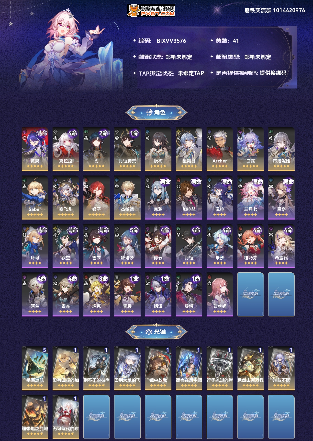 【崩坏·星穹铁道】【lyxq7306】冒险等级:70,男主,五星数量:24,绑定情况:手机号__五星角色:黄泉 6命|克拉拉 4命|刃 2命|丹恒·腾荒 1命|阮·梅|星期日|archer|白露|布洛妮娅|saber|赛飞儿|姬子|杰帕德__五星光锥:星海巡航 5精|没有回报的加冕|到不了的彼岸|回到大地的飞行|镜中故我|谎言在风中飘扬|行于流逝的岸|纵然山河万程|时节不居|理想燃烧的地狱|无可取代的东西,【邮箱未绑定】