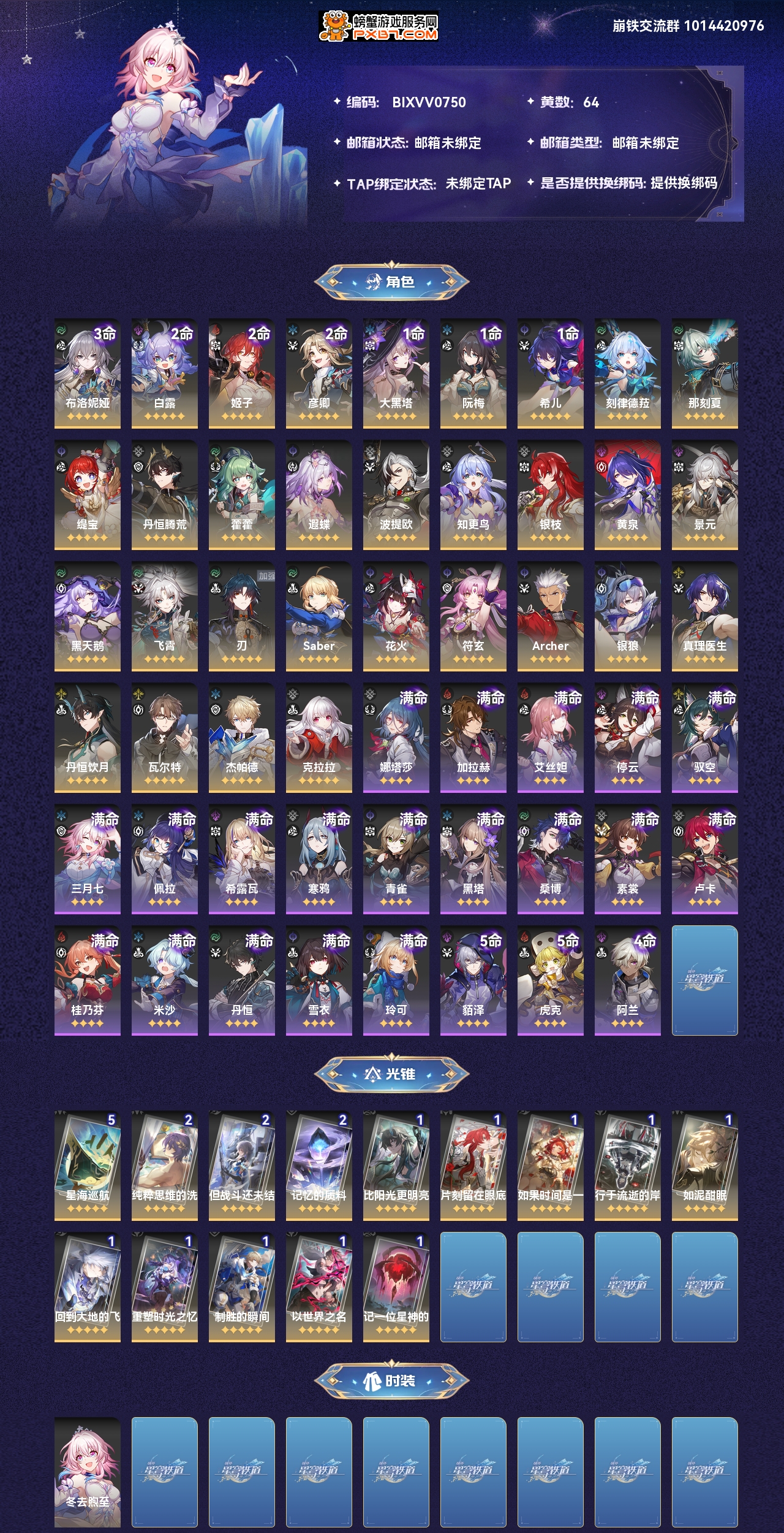 【崩坏·星穹铁道】【lyxq7307】冒险等级:70,男主,五星数量:45,绑定情况:手机号__五星角色:布洛妮娅 3命|白露 2命|姬子 2命|彦卿 2命|大黑塔 1命|阮·梅 1命|希儿 1命|刻律德菈|那刻夏|缇宝|丹恒·腾荒|藿藿|遐蝶|波提欧|知更鸟|银枝|黄泉|景元|黑天鹅|飞霄|刃|saber|花火|符玄|archer|银狼|真理医生|丹恒·饮月|瓦尔特|杰帕德|克拉拉__五星光锥:星海巡航 5精|纯粹思维的洗礼 2精|但战斗还未结束 2精|记忆的质料 2精|比阳光更明亮的|片刻,留在眼底|如果时间是一朵花|行于流逝的岸|如泥酣眠|回到大地的飞行|重塑时光之忆|制胜的瞬间|以世界之名|记一位星神的陨落,【邮箱未绑定】