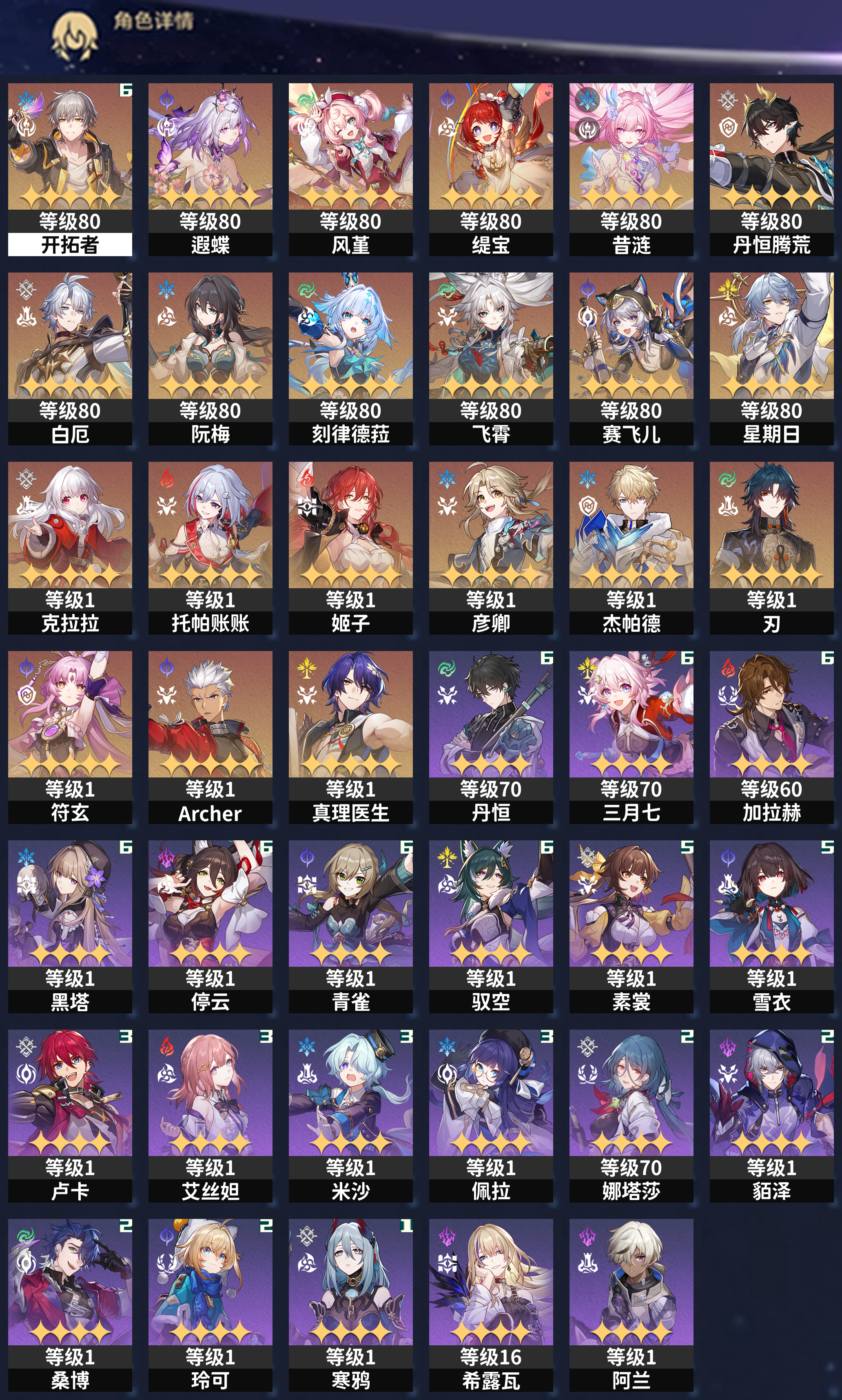 【崩坏·星穹铁道】【lyxq6534】冒险等级:66,男主,五星数量:26,绑定情况:邮箱__五星角色:遐蝶|风堇|缇宝|昔涟|丹恒·腾荒|白厄|阮·梅|刻律德菈|飞霄|赛飞儿|星期日|克拉拉|托帕账账|姬子|彦卿|杰帕德|刃|符玄|archer|真理医生__五星光锥:黎明恰如此燃烧|星海巡航|谎言在风中飘扬|记忆永不落幕|理想燃烧的地狱|制胜的瞬间,【邮箱未实名】