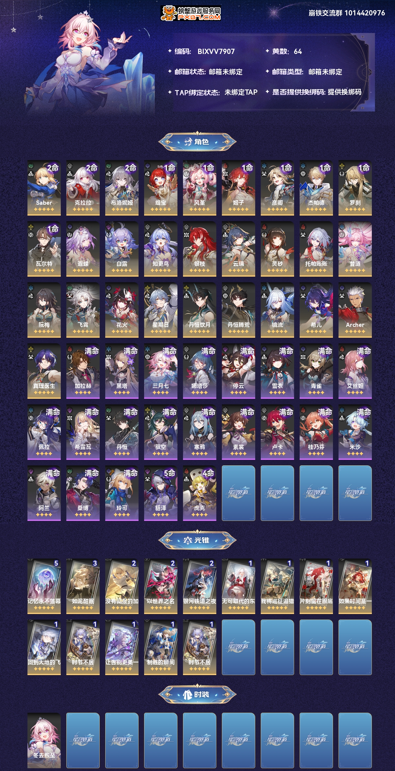 【崩坏·星穹铁道】【lyxq7295】冒险等级:70,女主,五星数量:41,绑定情况:手机号__五星角色:saber 2命|克拉拉 2命|布洛妮娅 2命|缇宝 1命|风堇 1命|姬子 1命|彦卿 1命|杰帕德 1命|罗刹 1命|瓦尔特 1命|遐蝶|白露|知更鸟|银枝|云璃|灵砂|托帕账账|昔涟|阮·梅|飞霄|花火|星期日|丹恒·饮月|丹恒·腾荒|镜流|希儿|archer|真理医生__五星光锥:记忆永不落幕 5精|如泥酣眠 3精|没有回报的加冕 2精|以世界之名 2精|银河铁道之夜 2精|无可取代的东西|我将,巡征追猎|片刻,留在眼底|如果时间是一朵花|回到大地的飞行|时节不居|让告别,更美一些|制胜的瞬间,【邮箱未绑定】