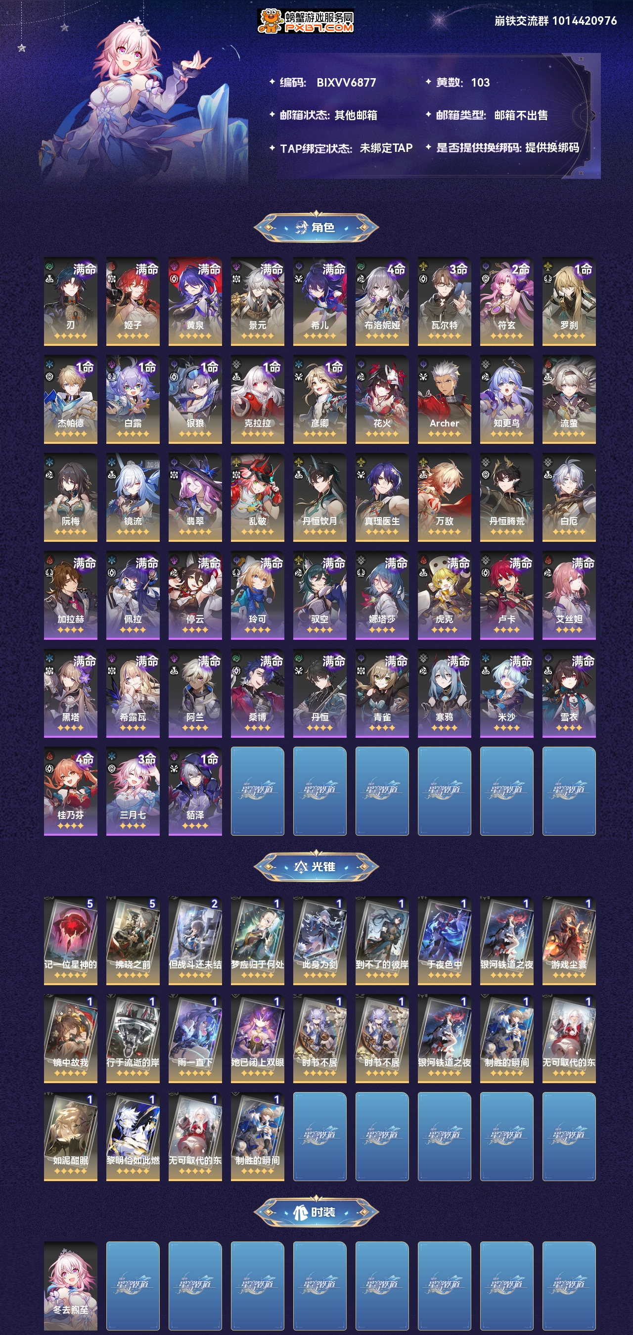 【崩坏·星穹铁道】【lyxq7312】冒险等级:70,女主,五星数量:45,绑定情况:邮箱__五星角色:刃 6命|姬子 6命|黄泉 6命|景元 6命|希儿 6命|布洛妮娅 4命|瓦尔特 3命|符玄 2命|罗刹 1命|杰帕德 1命|白露 1命|银狼 1命|克拉拉 1命|彦卿 1命|花火|archer|知更鸟|流萤|阮·梅|镜流|翡翠|乱破|丹恒·饮月|真理医生|万敌|丹恒·腾荒|白厄__五星光锥:记一位星神的陨落 5精|拂晓之前 5精|但战斗还未结束 2精|梦应归于何处|此身为剑|到不了的彼岸|于夜色中|银河铁道之夜|游戏尘寰|镜中故我|行于流逝的岸|雨一直下|她已闭上双眼|时节不居|制胜的瞬间|无可取代的东西|如泥酣眠|黎明恰如此燃烧,【邮箱不出售】