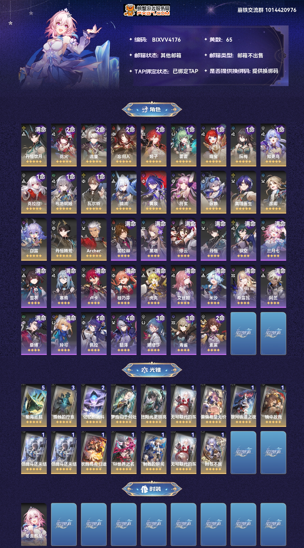 【崩坏·星穹铁道】【lyxq7325】冒险等级:70,男主,五星数量:35,绑定情况:邮箱|taptap__五星角色:丹恒·饮月 6命|花火 2命|流萤 2命|忘归人 2命|姬子 2命|藿藿 1命|缇宝 1命|阮·梅 1命|知更鸟 1命|克拉拉 1命|布洛妮娅 1命|瓦尔特 1命|镜流|黄泉|符玄|银狼|真理医生|彦卿|白露|丹恒·腾荒|archer__五星光锥:星海巡航 5精|孤独的疗愈 3精|记忆的质料 2精|梦应归于何处|比阳光更明亮的|无可取代的东西|偏偏希望无价|银河铁道之夜|镜中故我|但战斗还未结束|长路终有归途|以世界之名|制胜的瞬间|时节不居,【邮箱不出售】