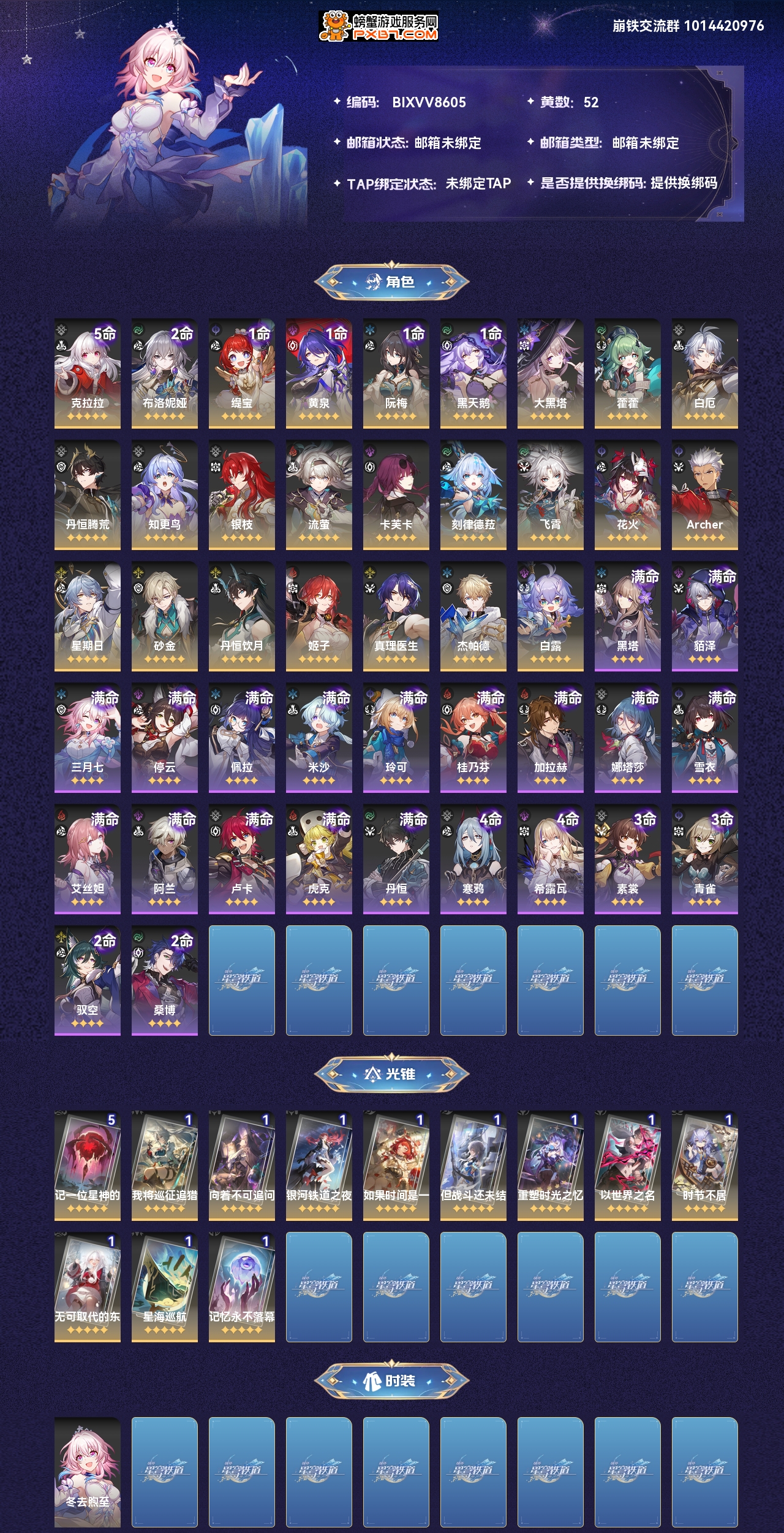 【崩坏·星穹铁道】【lyxq7326】冒险等级:70,男主,五星数量:37,绑定情况:手机号__五星角色:克拉拉 5命|布洛妮娅 2命|缇宝 1命|黄泉 1命|阮·梅 1命|黑天鹅 1命|大黑塔|藿藿|白厄|丹恒·腾荒|知更鸟|银枝|流萤|卡芙卡|刻律德菈|飞霄|花火|archer|星期日|砂金|丹恒·饮月|姬子|真理医生|杰帕德|白露__五星光锥:记一位星神的陨落 5精|我将,巡征追猎|向着不可追问处|银河铁道之夜|如果时间是一朵花|但战斗还未结束|重塑时光之忆|以世界之名|时节不居|无可取代的东西|星海巡航|记忆永不落幕,【邮箱未绑定】