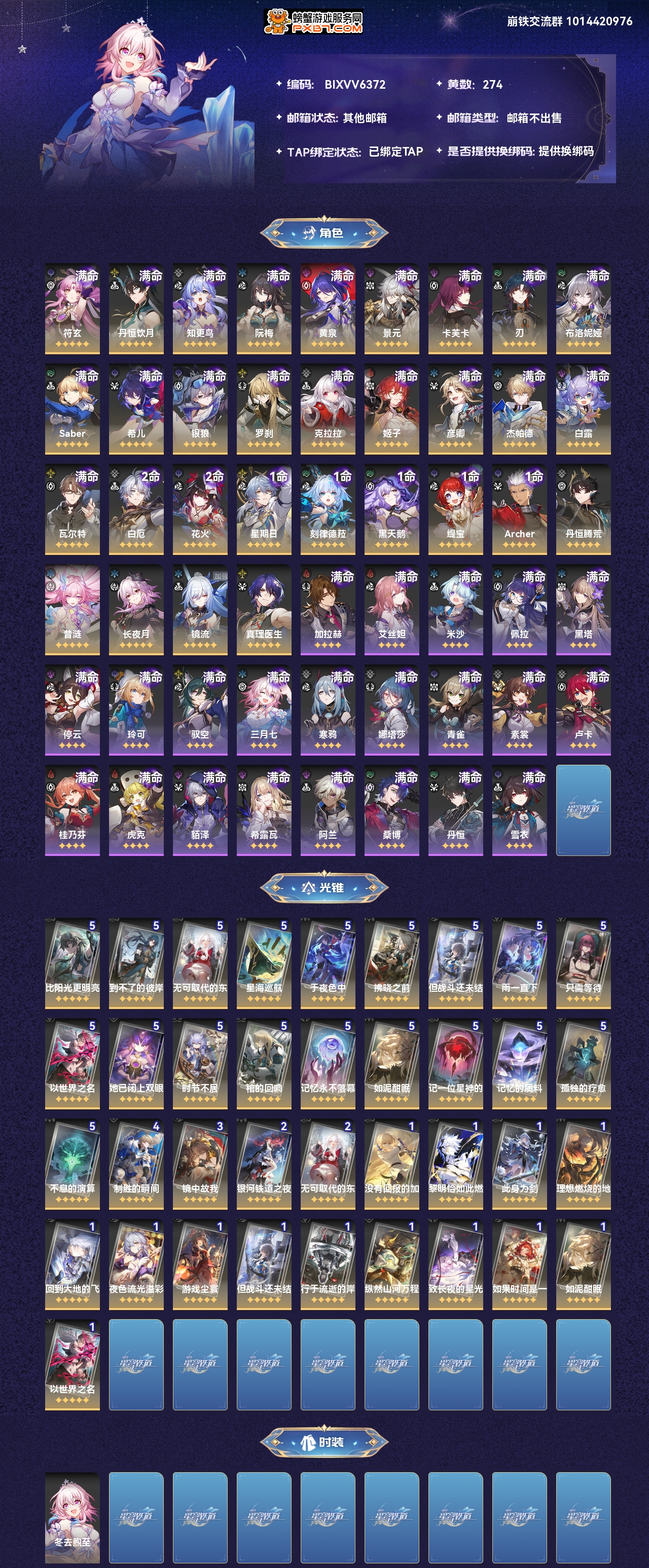 【崩坏·星穹铁道】【lyxq7371】冒险等级:70,男主,五星数量:64,绑定情况:邮箱|taptap__五星角色:符玄 6命|丹恒·饮月 6命|知更鸟 6命|阮·梅 6命|黄泉 6命|景元 6命|卡芙卡 6命|刃 6命|布洛妮娅 6命|saber 6命|希儿 6命|银狼 6命|罗刹 6命|克拉拉 6命|姬子 6命|彦卿 6命|杰帕德 6命|白露 6命|瓦尔特 6命|白厄 2命|花火 2命|星期日 1命|刻律德菈 1命|黑天鹅 1命|缇宝 1命|archer 1命|丹恒·腾荒|昔涟|长夜月|镜流|真理医生__五星光锥:比阳光更明亮的 5精|到不了的彼岸 5精|无可取代的东西 5精|星海巡航 5精|于夜色中 5精|拂晓之前 5精|但战斗还未结束 5精|雨一直下 5精|只需等待 5精|以世界之名 5精|她已闭上双眼 5精|时节不居 5精|棺的回响 5精|记忆永不落幕 5精|如泥酣眠 5精|记一位星神的陨落 5精|记忆的质料 5精|孤独的疗愈 5精|不息的演算 5精|制胜的瞬间 4精|镜中故我 3精|银河铁道之夜 2精|没有回报的加冕|黎明恰如此燃烧|此身为剑|理想燃烧的地狱|回到大地的飞行|夜色流光溢彩|游戏尘寰|行于流逝的岸|纵然山河万程|致长夜的星光|如果时间是一朵花,【邮箱不出售】