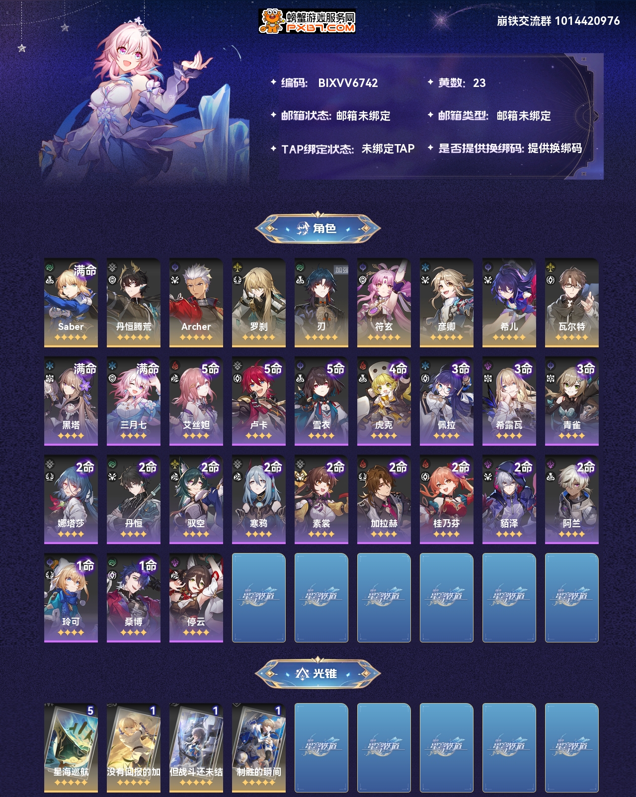 【崩坏·星穹铁道】【lyxq7375】冒险等级:67,女主,五星数量:13,绑定情况:手机号__五星角色:saber 6命|丹恒·腾荒|archer|罗刹|刃|符玄|彦卿|希儿|瓦尔特__五星光锥:星海巡航 5精|没有回报的加冕|但战斗还未结束|制胜的瞬间,【邮箱未绑定】