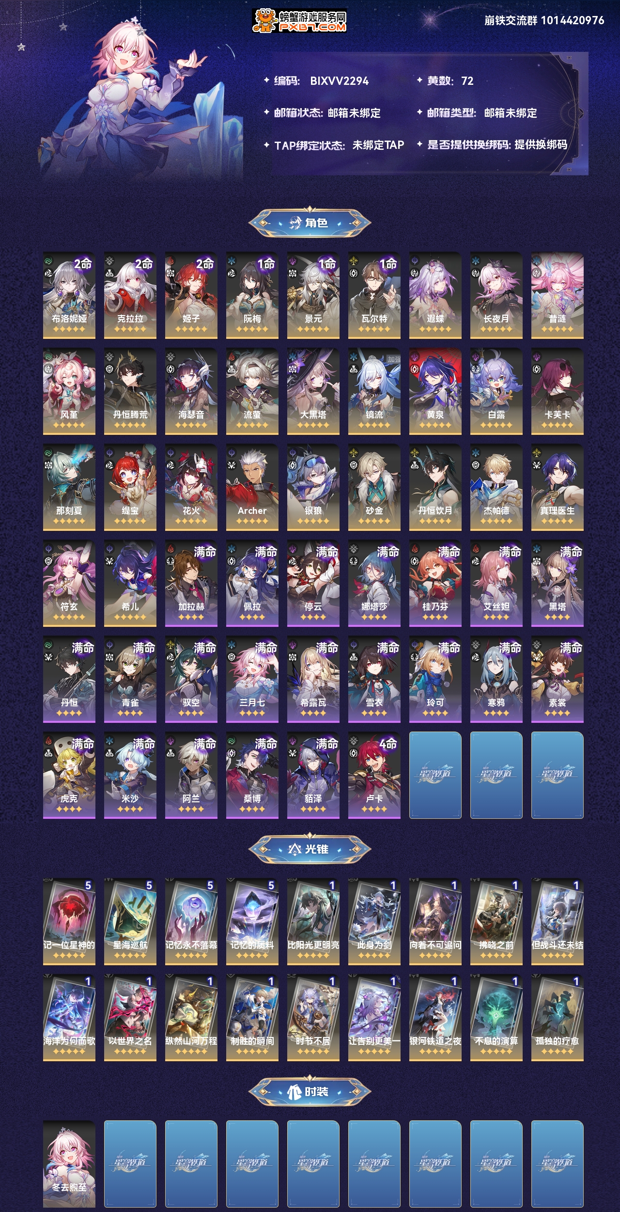 【崩坏·星穹铁道】【lyxq7374】冒险等级:70,女主,五星数量:47,绑定情况:邮箱__五星角色:布洛妮娅 2命|克拉拉 2命|姬子 2命|阮·梅 1命|景元 1命|瓦尔特 1命|遐蝶|长夜月|昔涟|风堇|丹恒·腾荒|海瑟音|流萤|大黑塔|镜流|黄泉|白露|卡芙卡|那刻夏|缇宝|花火|archer|银狼|砂金|丹恒·饮月|杰帕德|真理医生|符玄|希儿__五星光锥:记一位星神的陨落 5精|星海巡航 5精|记忆永不落幕 5精|记忆的质料 5精|比阳光更明亮的|此身为剑|向着不可追问处|拂晓之前|但战斗还未结束|海洋为何而歌|以世界之名|纵然山河万程|制胜的瞬间|时节不居|让告别,更美一些|银河铁道之夜|不息的演算|孤独的疗愈,【邮箱未绑定】