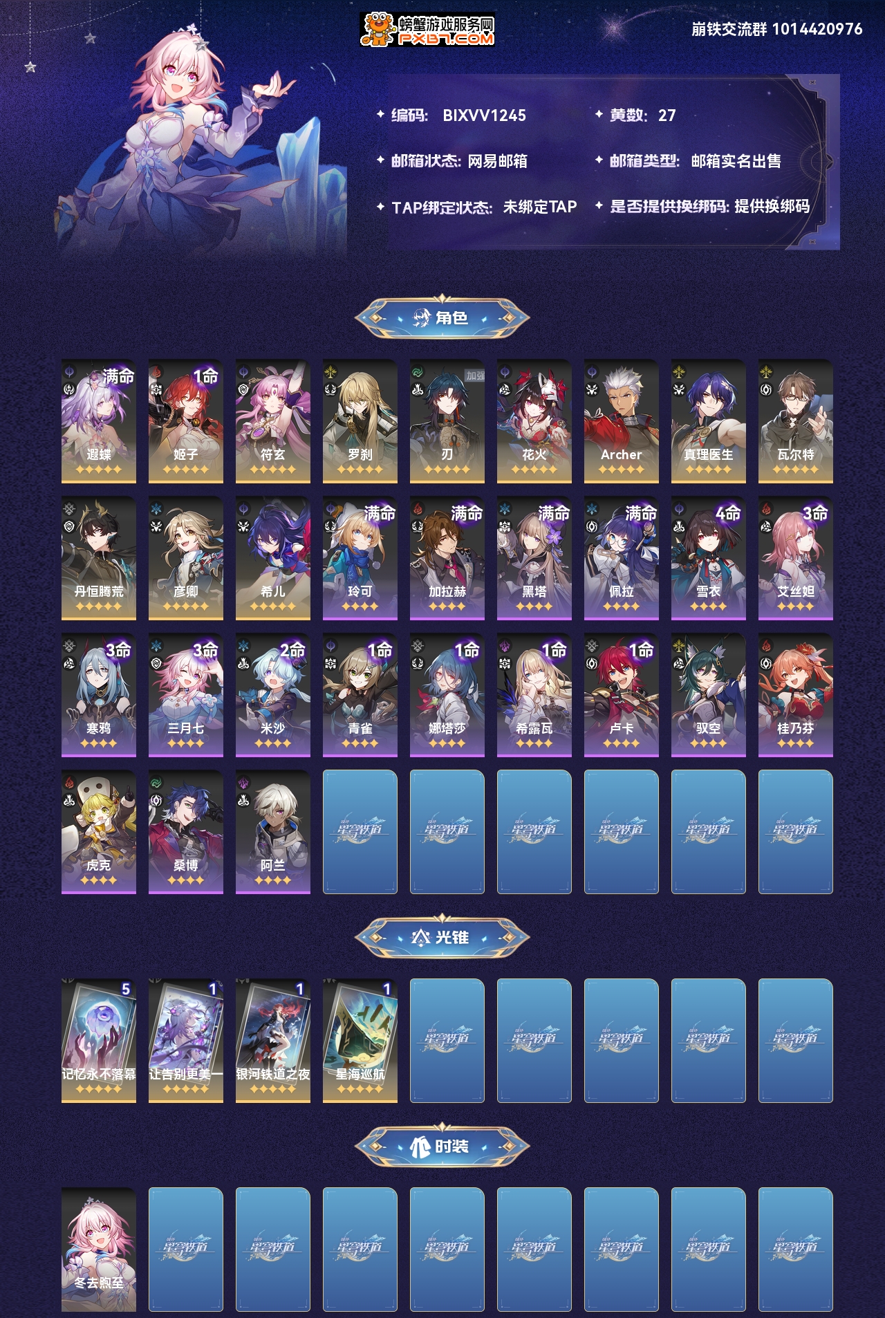 【崩坏·星穹铁道】【lyxq7333】冒险等级:65,女主,五星数量:16,绑定情况:邮箱__五星角色:遐蝶 6命|姬子 1命|符玄|罗刹|刃|花火|archer|真理医生|瓦尔特|丹恒·腾荒|彦卿|希儿__五星光锥:记忆永不落幕 5精|让告别,更美一些|银河铁道之夜|星海巡航,【邮箱已实名】