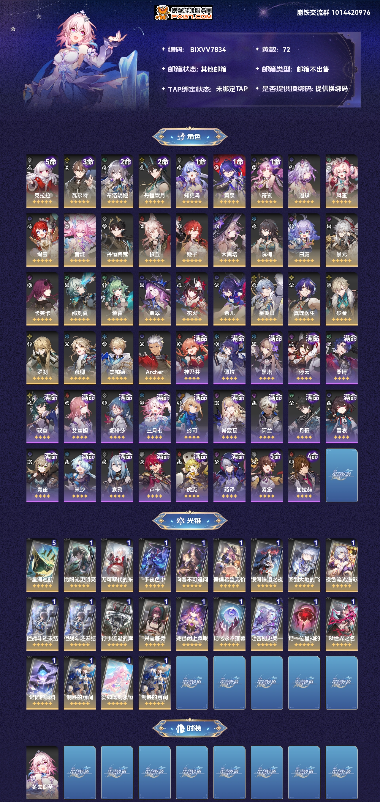 【崩坏·星穹铁道】【lyxq7404】冒险等级:70,女主,五星数量:51,绑定情况:邮箱__五星角色:克拉拉 5命|瓦尔特 3命|布洛妮娅 2命|丹恒·饮月 2命|知更鸟 1命|黄泉 1命|符玄 1命|遐蝶|风堇|缇宝|昔涟|丹恒·腾荒|椒丘|姬子|大黑塔|阮·梅|白露|景元|卡芙卡|那刻夏|藿藿|翡翠|花火|希儿|星期日|真理医生|砂金|罗刹|彦卿|杰帕德|archer__五星光锥:星海巡航 5精|比阳光更明亮的|无可取代的东西|于夜色中|向着不可追问处|偏偏希望无价|银河铁道之夜|回到大地的飞行|夜色流光溢彩|但战斗还未结束|行于流逝的岸|只需等待|她已闭上双眼|记忆永不落幕|让告别,更美一些|记一位星神的陨落|以世界之名|记忆的质料|制胜的瞬间|爱如此刻永恒,【邮箱不出售】