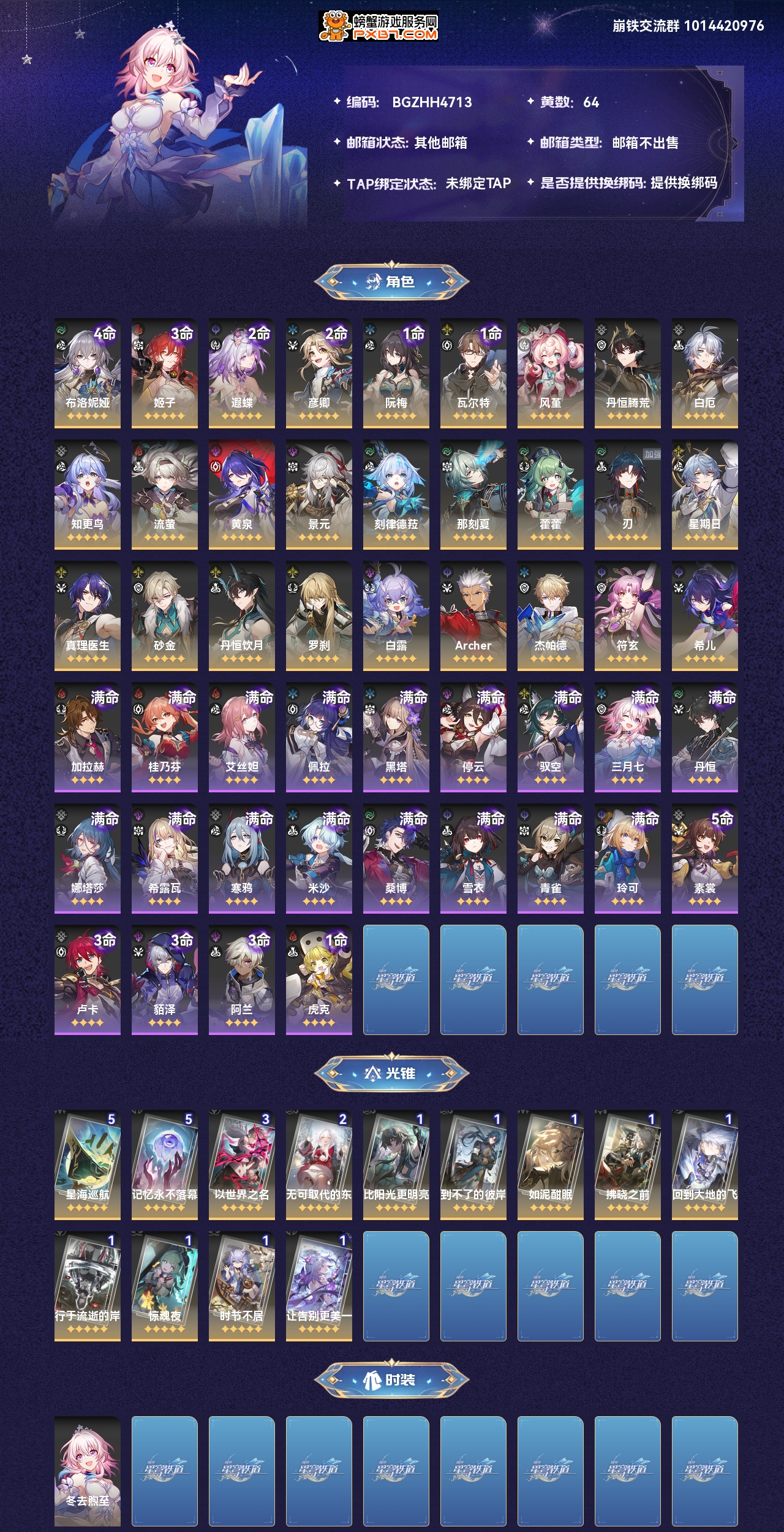 【崩坏·星穹铁道】【lyxq7443】冒险等级:70,女主,五星数量:40,绑定情况:邮箱__五星角色:布洛妮娅 4命|姬子 3命|遐蝶 2命|彦卿 2命|阮·梅 1命|瓦尔特 1命|风堇|丹恒·腾荒|白厄|知更鸟|流萤|黄泉|景元|刻律德菈|那刻夏|藿藿|刃|星期日|真理医生|砂金|丹恒·饮月|罗刹|白露|archer|杰帕德|符玄|希儿__五星光锥:星海巡航 5精|记忆永不落幕 5精|以世界之名 3精|无可取代的东西 2精|比阳光更明亮的|到不了的彼岸|如泥酣眠|拂晓之前|回到大地的飞行|行于流逝的岸|惊魂夜|时节不居|让告别,更美一些,【邮箱不出售】