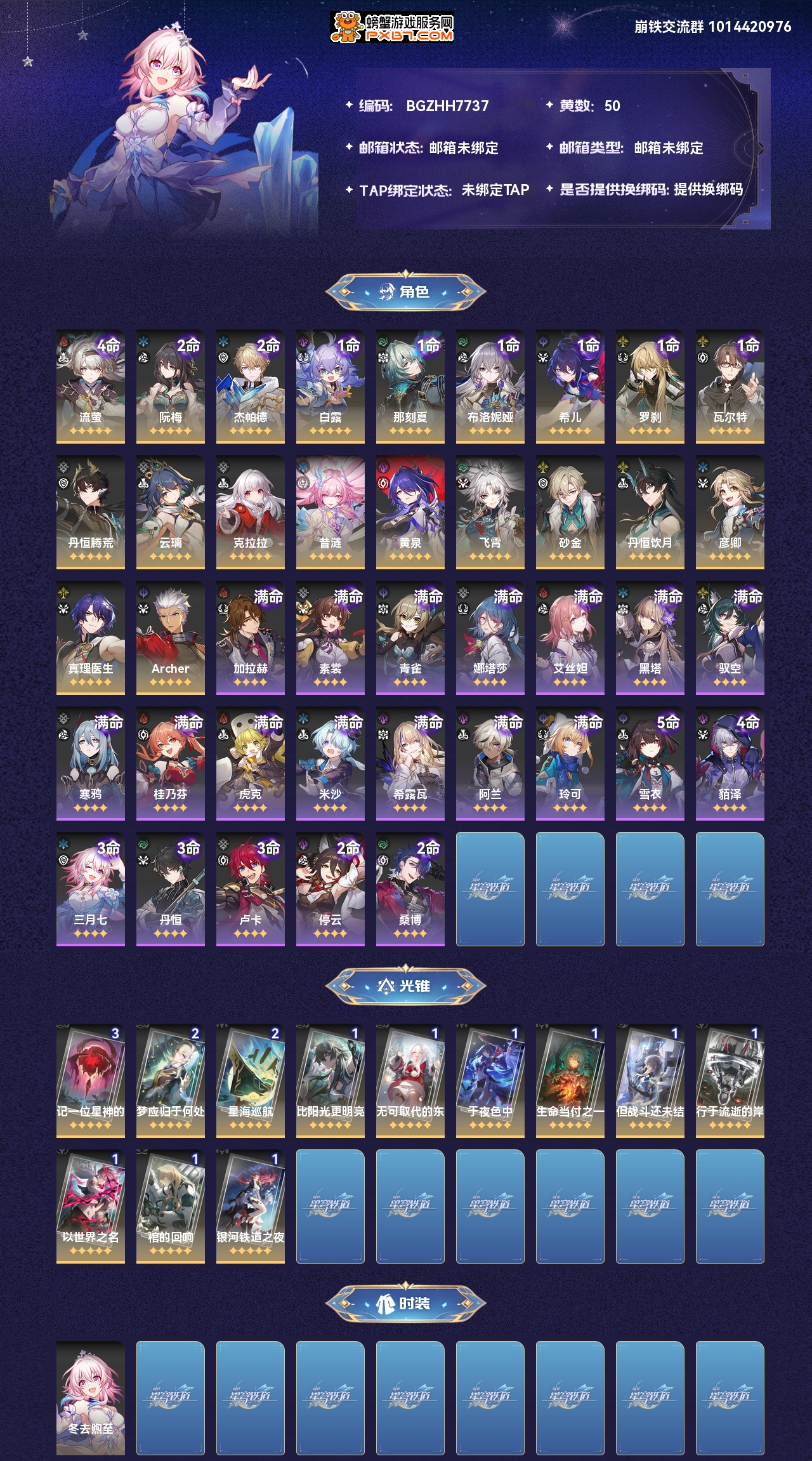 【崩坏·星穹铁道】【lyxq7436】冒险等级:70,男主,五星数量:32,绑定情况:手机号__五星角色:流萤 4命|阮·梅 2命|杰帕德 2命|白露 1命|那刻夏 1命|布洛妮娅 1命|希儿 1命|罗刹 1命|瓦尔特 1命|丹恒·腾荒|云璃|克拉拉|昔涟|黄泉|飞霄|砂金|丹恒·饮月|彦卿|真理医生|archer__五星光锥:记一位星神的陨落 3精|梦应归于何处 2精|星海巡航 2精|比阳光更明亮的|无可取代的东西|于夜色中|生命当付之一炬|但战斗还未结束|行于流逝的岸|以世界之名|棺的回响|银河铁道之夜,【邮箱未绑定】