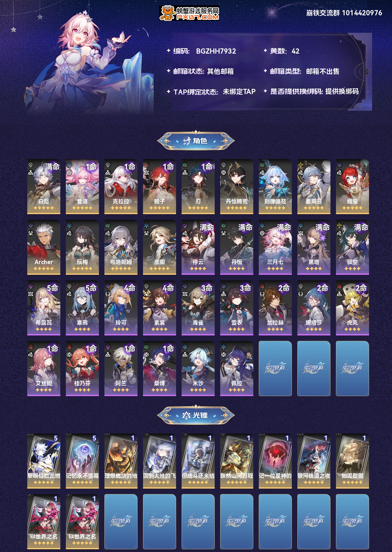 【崩坏·星穹铁道】【lyxq7461】冒险等级:68,女主,五星数量:23,绑定情况:邮箱__五星角色:白厄 6命|昔涟 1命|克拉拉 1命|姬子 1命|刃 1命|丹恒·腾荒|刻律德菈|星期日|缇宝|archer|阮·梅|布洛妮娅|彦卿__五星光锥:黎明恰如此燃烧 5精|记忆永不落幕 5精|理想燃烧的地狱|回到大地的飞行|但战斗还未结束|纵然山河万程|记一位星神的陨落|银河铁道之夜|如泥酣眠|以世界之名,【邮箱不出售】