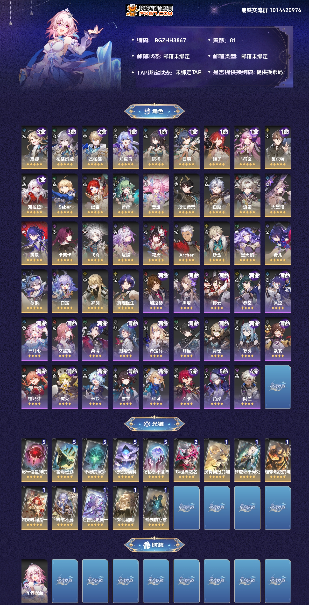 【崩坏·星穹铁道】【lyxq7463】冒险等级:70,女主,五星数量:45,绑定情况:手机号__五星角色:彦卿 3命|布洛妮娅 3命|杰帕德 2命|知更鸟 1命|阮·梅 1命|云璃 1命|姬子 1命|符玄 1命|瓦尔特 1命|克拉拉 1命|saber|缇宝|藿藿|昔涟|丹恒·腾荒|白厄|流萤|大黑塔|黄泉|卡芙卡|飞霄|遐蝶|花火|archer|砂金|黑天鹅|希儿|银狼|白露|罗刹|真理医生__五星光锥:记一位星神的陨落 5精|星海巡航 5精|不息的演算 5精|记忆的质料 5精|记忆永不落幕 5精|以世界之名 2精|没有回报的加冕|梦应归于何处|理想燃烧的地狱|如果时间是一朵花|时节不居|让告别,更美一些|如泥酣眠|孤独的疗愈,【邮箱未绑定】