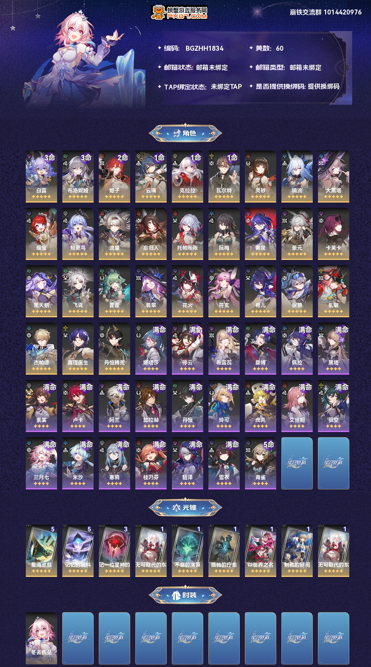 【崩坏·星穹铁道】【lyxq7490】冒险等级:70,女主,五星数量:38,绑定情况:手机号__五星角色:白露 3命|布洛妮娅 3命|姬子 2命|云璃 1命|克拉拉 1命|瓦尔特 1命|灵砂|镜流|大黑塔|缇宝|知更鸟|流萤|忘归人|托帕账账|阮·梅|黄泉|景元|卡芙卡|黑天鹅|飞霄|藿藿|翡翠|花火|符玄|希儿|银狼|乱破|杰帕德|真理医生|丹恒·腾荒__五星光锥:星海巡航 5精|记忆的质料 5精|记一位星神的陨落 3精|无可取代的东西|不息的演算|孤独的疗愈|以世界之名|制胜的瞬间,【邮箱未绑定】