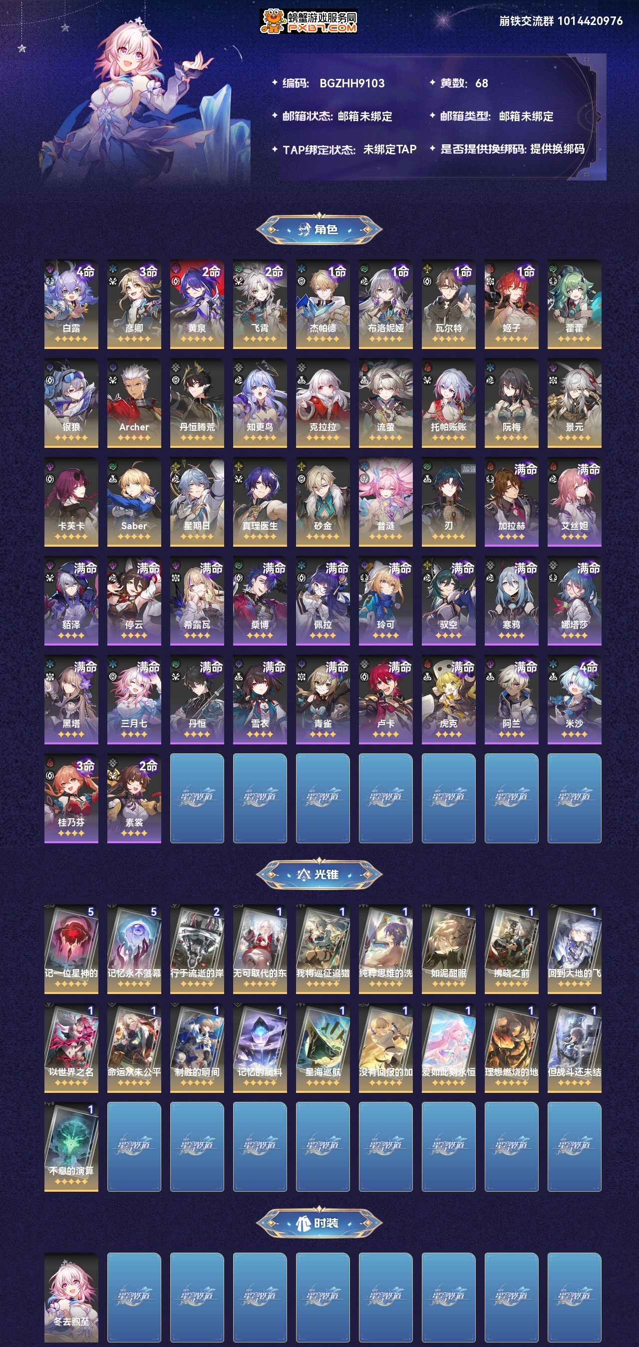 【崩坏·星穹铁道】【lyxq7502】冒险等级:70,女主,五星数量:44,绑定情况:手机号__五星角色:白露 4命|彦卿 3命|黄泉 2命|飞霄 2命|杰帕德 1命|布洛妮娅 1命|瓦尔特 1命|姬子 1命|藿藿|银狼|archer|丹恒·腾荒|知更鸟|克拉拉|流萤|托帕账账|阮·梅|景元|卡芙卡|saber|星期日|真理医生|砂金|昔涟|刃__五星光锥:记一位星神的陨落 5精|记忆永不落幕 5精|行于流逝的岸 2精|无可取代的东西|我将,巡征追猎|纯粹思维的洗礼|如泥酣眠|拂晓之前|回到大地的飞行|以世界之名|命运从未公平|制胜的瞬间|记忆的质料|星海巡航|没有回报的加冕|爱如此刻永恒|理想燃烧的地狱|但战斗还未结束|不息的演算,【邮箱未绑定】