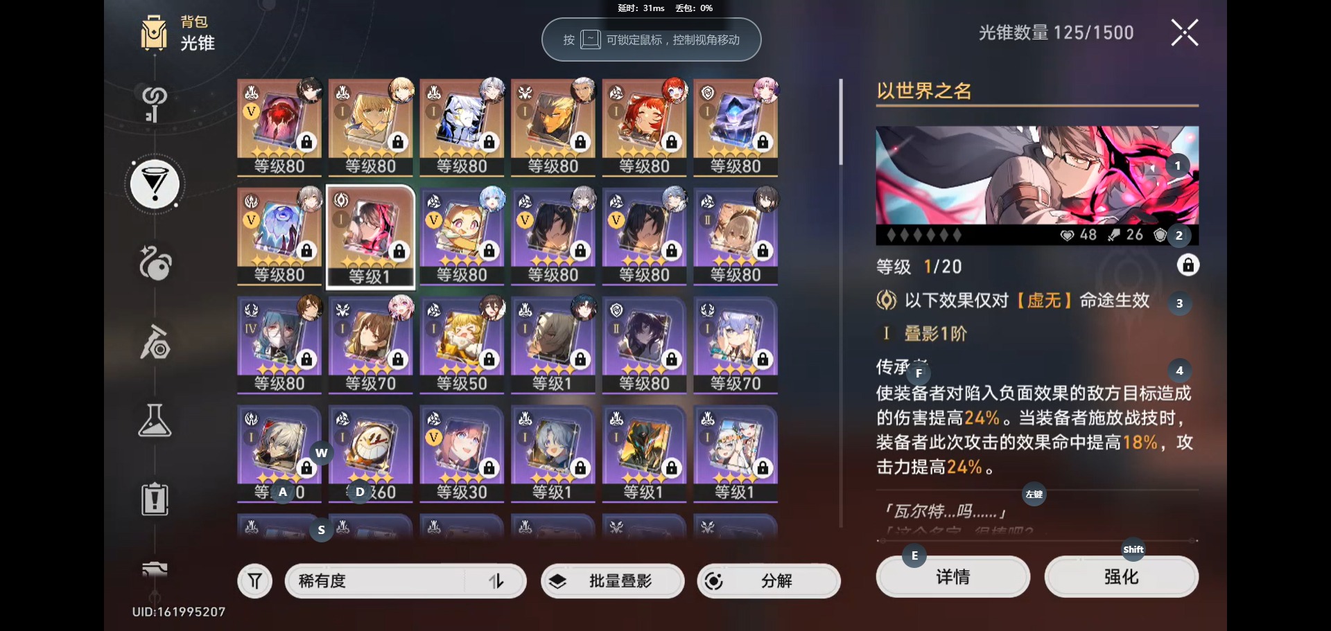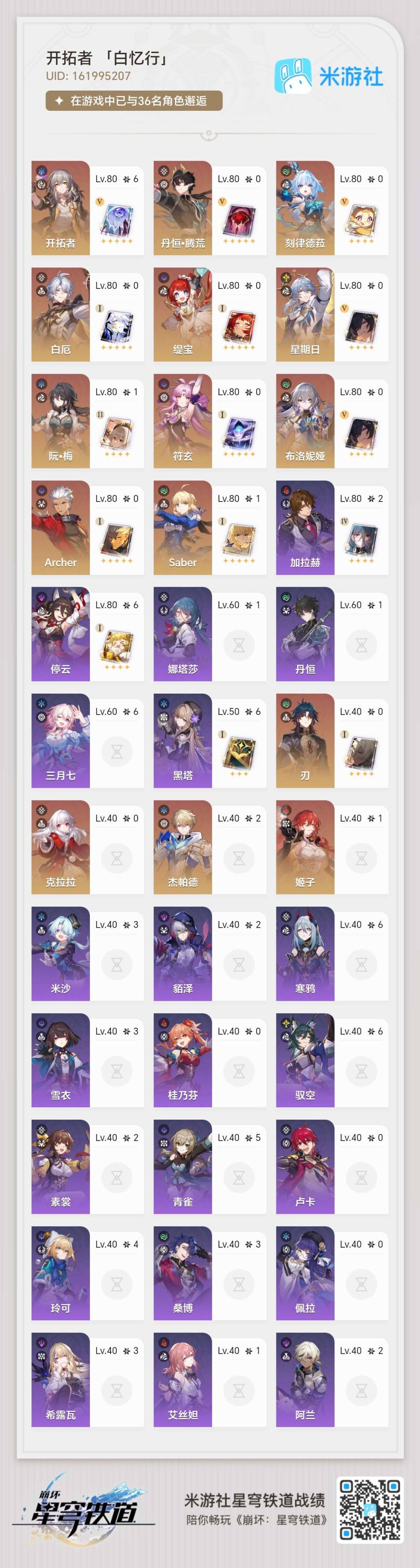 [14286336]【总黄数】:30 【2命金色角色】:2命杰帕德 【1命金色角色】:1命saber1命姬子1命阮•梅 【0命金色角色】:0命星期日0命缇宝0命白厄0命archer0命刻律德菈0命丹恒·腾荒0命布洛妮娅0命克拉拉0命刃0命符玄 【精5武器】:精5记忆永不落幕精5记一位星神的陨落 【精1武器】:精1如果时间是一朵花精1黎明恰如此燃烧精1没有回报的加冕精1理想燃烧的地狱精1以世界之名精1记忆的质料