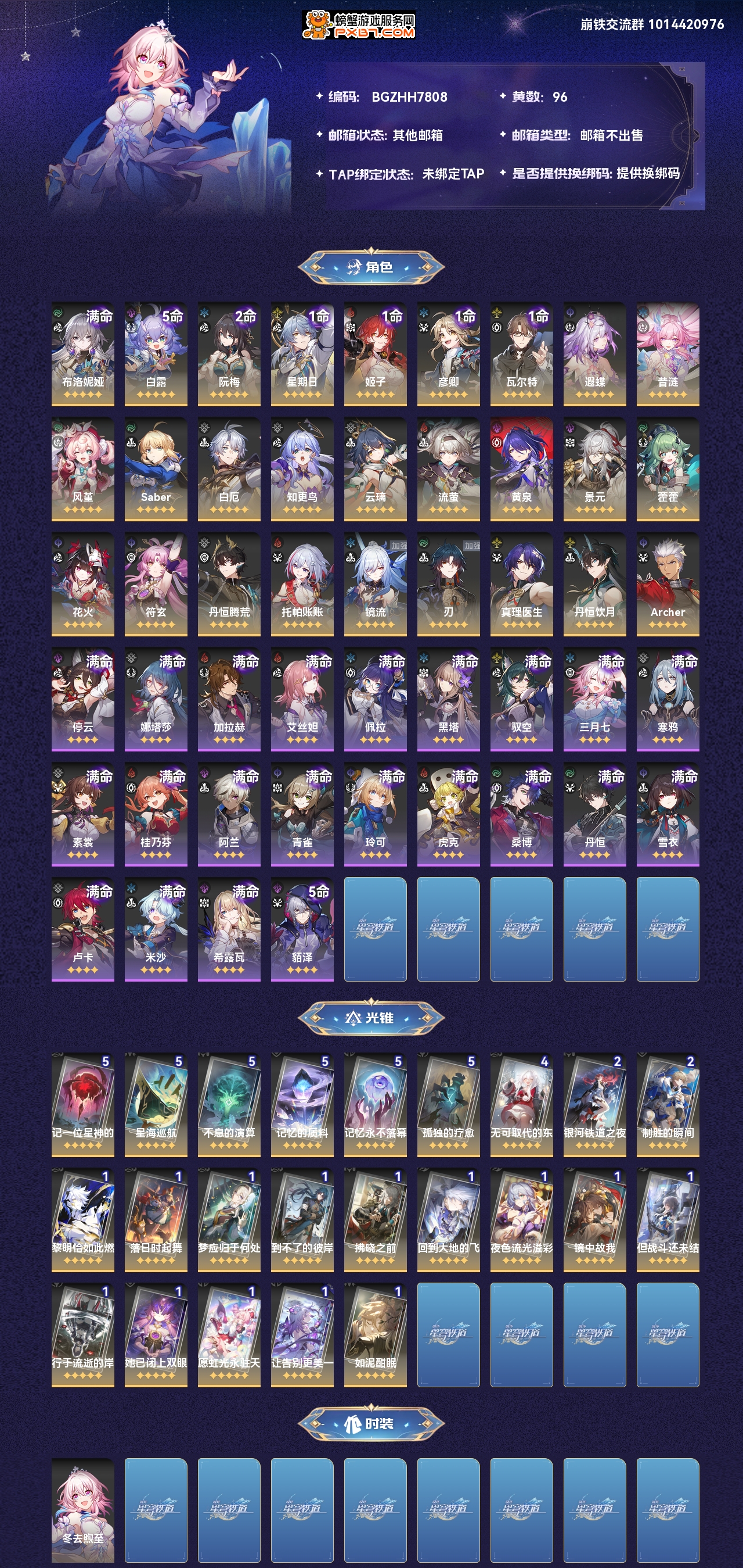 【崩坏·星穹铁道】【lyxq7495】冒险等级:70,女主,五星数量:50,绑定情况:邮箱__五星角色:布洛妮娅 6命|白露 5命|阮·梅 2命|星期日 1命|姬子 1命|彦卿 1命|瓦尔特 1命|遐蝶|昔涟|风堇|saber|白厄|知更鸟|云璃|流萤|黄泉|景元|藿藿|花火|符玄|丹恒·腾荒|托帕账账|镜流|刃|真理医生|丹恒·饮月|archer__五星光锥:记一位星神的陨落 5精|星海巡航 5精|不息的演算 5精|记忆的质料 5精|记忆永不落幕 5精|孤独的疗愈 5精|无可取代的东西 4精|银河铁道之夜 2精|制胜的瞬间 2精|黎明恰如此燃烧|落日时起舞|梦应归于何处|到不了的彼岸|拂晓之前|回到大地的飞行|夜色流光溢彩|镜中故我|但战斗还未结束|行于流逝的岸|她已闭上双眼|愿虹光永驻天空|让告别,更美一些|如泥酣眠,【邮箱不出售】