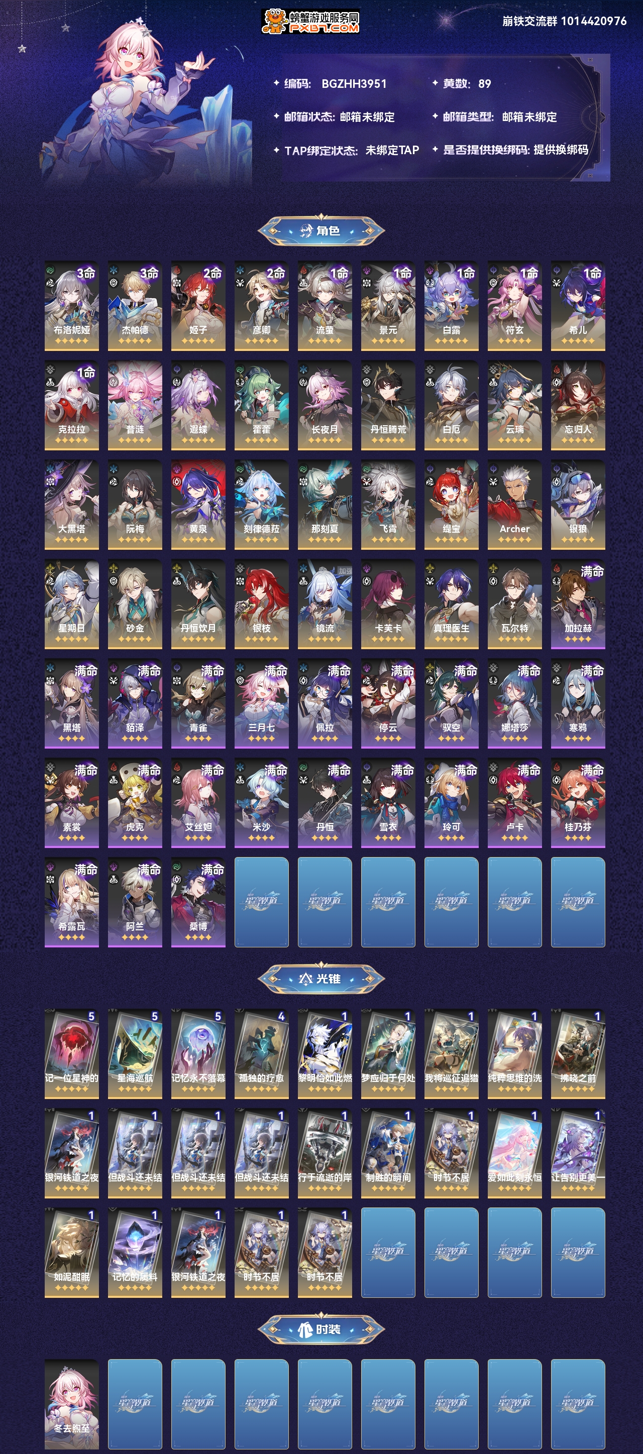 【崩坏·星穹铁道】【lyxq7514】冒险等级:70,女主,五星数量:53,绑定情况:手机号__五星角色:布洛妮娅 3命|杰帕德 3命|姬子 2命|彦卿 2命|流萤 1命|景元 1命|白露 1命|符玄 1命|希儿 1命|克拉拉 1命|昔涟|遐蝶|藿藿|长夜月|丹恒·腾荒|白厄|云璃|忘归人|大黑塔|阮·梅|黄泉|刻律德菈|那刻夏|飞霄|缇宝|archer|银狼|星期日|砂金|丹恒·饮月|银枝|镜流|卡芙卡|真理医生|瓦尔特__五星光锥:记一位星神的陨落 5精|星海巡航 5精|记忆永不落幕 5精|孤独的疗愈 4精|黎明恰如此燃烧|梦应归于何处|我将,巡征追猎|纯粹思维的洗礼|拂晓之前|银河铁道之夜|但战斗还未结束|行于流逝的岸|制胜的瞬间|时节不居|爱如此刻永恒|让告别,更美一些|如泥酣眠|记忆的质料,【邮箱未绑定】