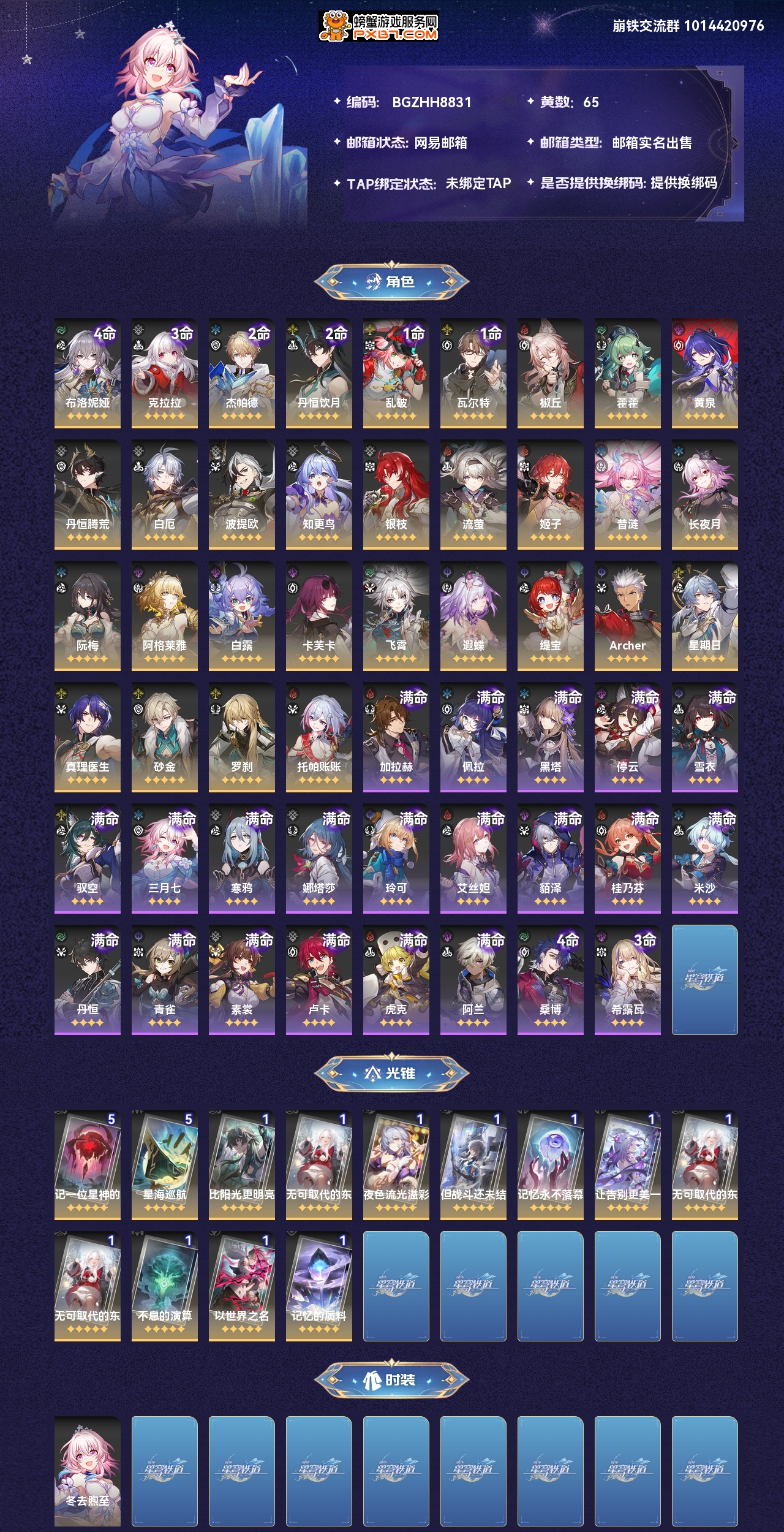 【崩坏·星穹铁道】【lyxq7487】冒险等级:70,男主,五星数量:42,绑定情况:邮箱__五星角色:布洛妮娅 4命|克拉拉 3命|杰帕德 2命|丹恒·饮月 2命|乱破 1命|瓦尔特 1命|椒丘|藿藿|黄泉|丹恒·腾荒|白厄|波提欧|知更鸟|银枝|流萤|姬子|昔涟|长夜月|阮·梅|阿格莱雅|白露|卡芙卡|飞霄|遐蝶|缇宝|archer|星期日|真理医生|砂金|罗刹|托帕账账__五星光锥:记一位星神的陨落 5精|星海巡航 5精|比阳光更明亮的|无可取代的东西|夜色流光溢彩|但战斗还未结束|记忆永不落幕|让告别,更美一些|不息的演算|以世界之名|记忆的质料,【邮箱已实名】