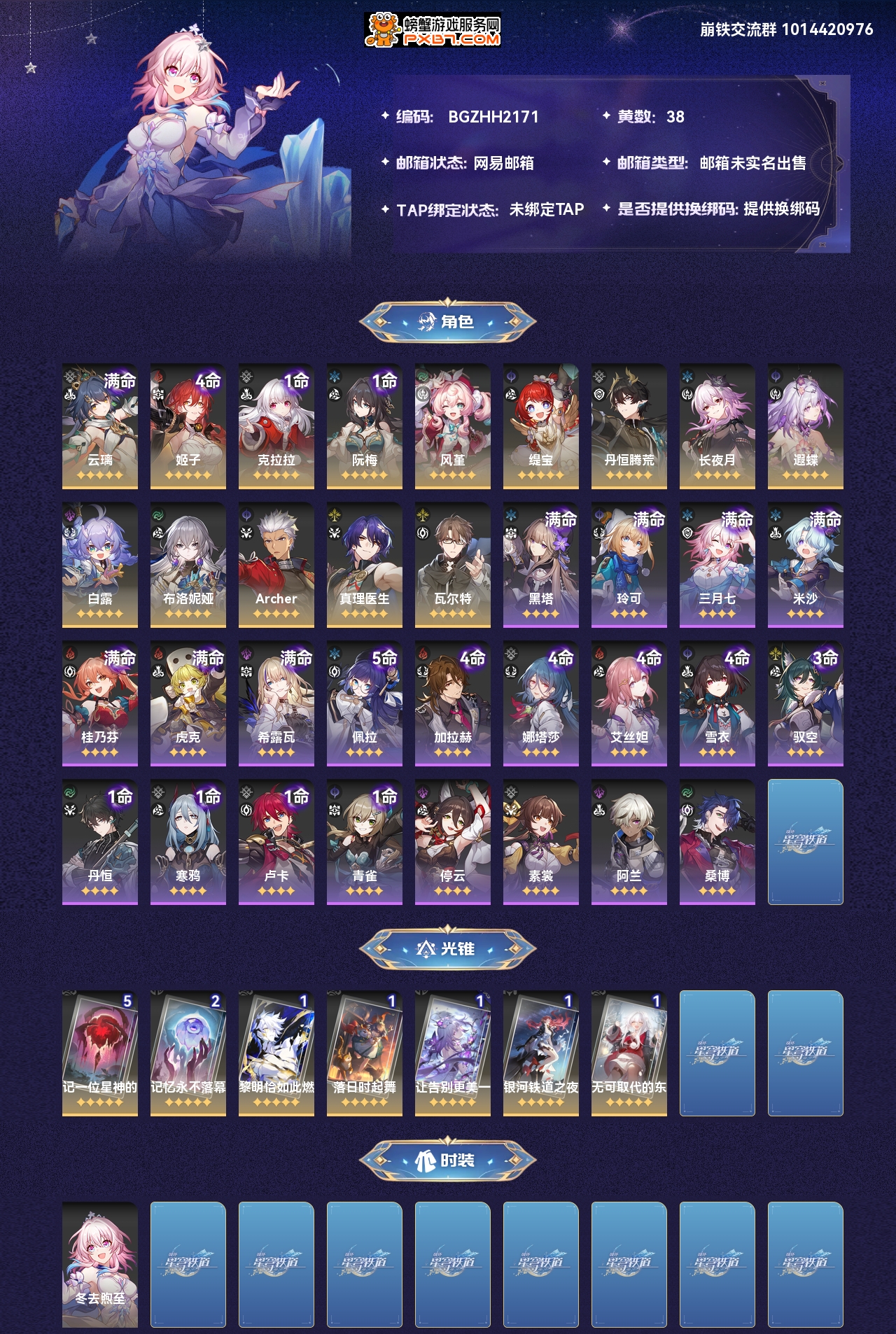 【崩坏·星穹铁道】【lyxq7558】冒险等级:70,女主,五星数量:21,绑定情况:邮箱__五星角色:云璃 6命|姬子 4命|克拉拉 1命|阮·梅 1命|风堇|缇宝|丹恒·腾荒|长夜月|遐蝶|白露|布洛妮娅|archer|真理医生|瓦尔特__五星光锥:记一位星神的陨落 5精|记忆永不落幕 2精|黎明恰如此燃烧|落日时起舞|让告别,更美一些|银河铁道之夜|无可取代的东西,【邮箱未实名】