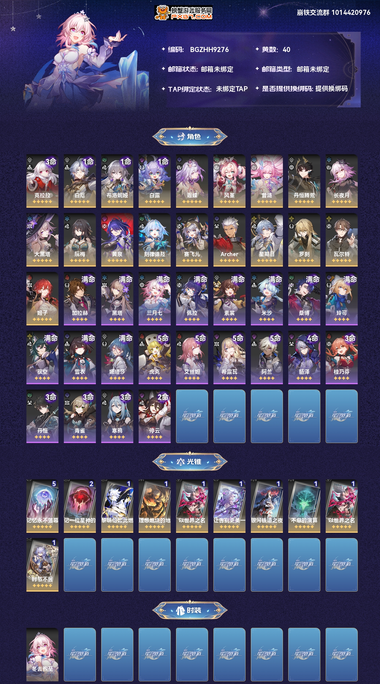 【崩坏·星穹铁道】【lyxq7552】冒险等级:70,女主,五星数量:28,绑定情况:手机号__五星角色:克拉拉 3命|白厄 1命|布洛妮娅 1命|白露 1命|遐蝶|风堇|昔涟|丹恒·腾荒|长夜月|大黑塔|阮·梅|黄泉|刻律德菈|赛飞儿|archer|星期日|罗刹|瓦尔特|姬子__五星光锥:记忆永不落幕 5精|记一位星神的陨落 2精|黎明恰如此燃烧|理想燃烧的地狱|以世界之名|让告别,更美一些|银河铁道之夜|不息的演算|时节不居,【邮箱未绑定】
