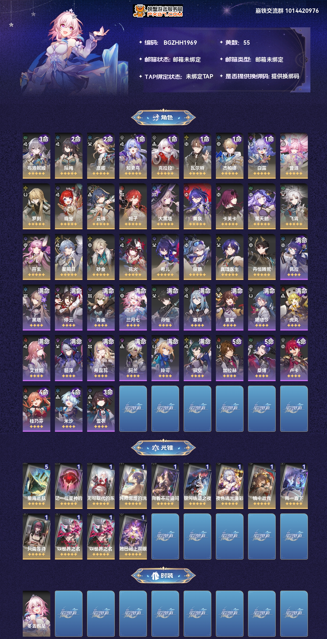【崩坏·星穹铁道】【lyxq7563】冒险等级:70,男主,五星数量:38,绑定情况:手机号__五星角色:布洛妮娅 3命|阮·梅 2命|彦卿 2命|知更鸟 1命|克拉拉 1命|瓦尔特 1命|杰帕德 1命|白露 1命|昔涟|罗刹|缇宝|云璃|姬子|大黑塔|黄泉|卡芙卡|黑天鹅|飞霄|符玄|星期日|砂金|花火|希儿|银狼|真理医生|丹恒·腾荒__五星光锥:星海巡航 5精|记一位星神的陨落|无可取代的东西|纯粹思维的洗礼|向着不可追问处|银河铁道之夜|夜色流光溢彩|镜中故我|雨一直下|只需等待|以世界之名|她已闭上双眼,【邮箱未绑定】