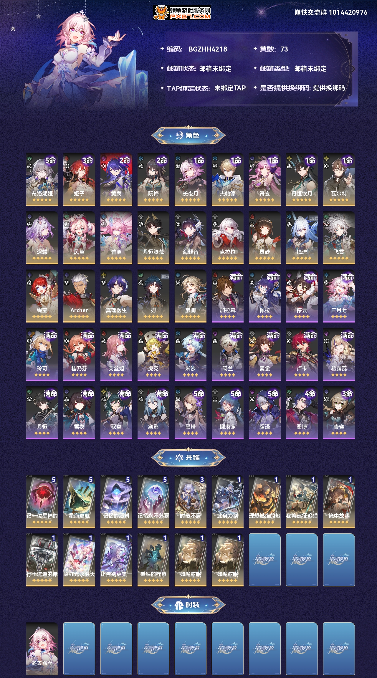 【崩坏·星穹铁道】【lyxq7538】冒险等级:70,女主,五星数量:37,绑定情况:手机号__五星角色:布洛妮娅 5命|姬子 3命|黄泉 2命|阮·梅 2命|长夜月 1命|杰帕德 1命|符玄 1命|丹恒·饮月 1命|瓦尔特 1命|遐蝶|风堇|昔涟|丹恒·腾荒|海瑟音|克拉拉|灵砂|镜流|飞霄|缇宝|archer|真理医生|刃|彦卿__五星光锥:记一位星神的陨落 5精|星海巡航 5精|记忆的质料 5精|记忆永不落幕 5精|时节不居 3精|此身为剑|理想燃烧的地狱|我将,巡征追猎|镜中故我|行于流逝的岸|愿虹光永驻天空|让告别,更美一些|孤独的疗愈|如泥酣眠,【邮箱未绑定】