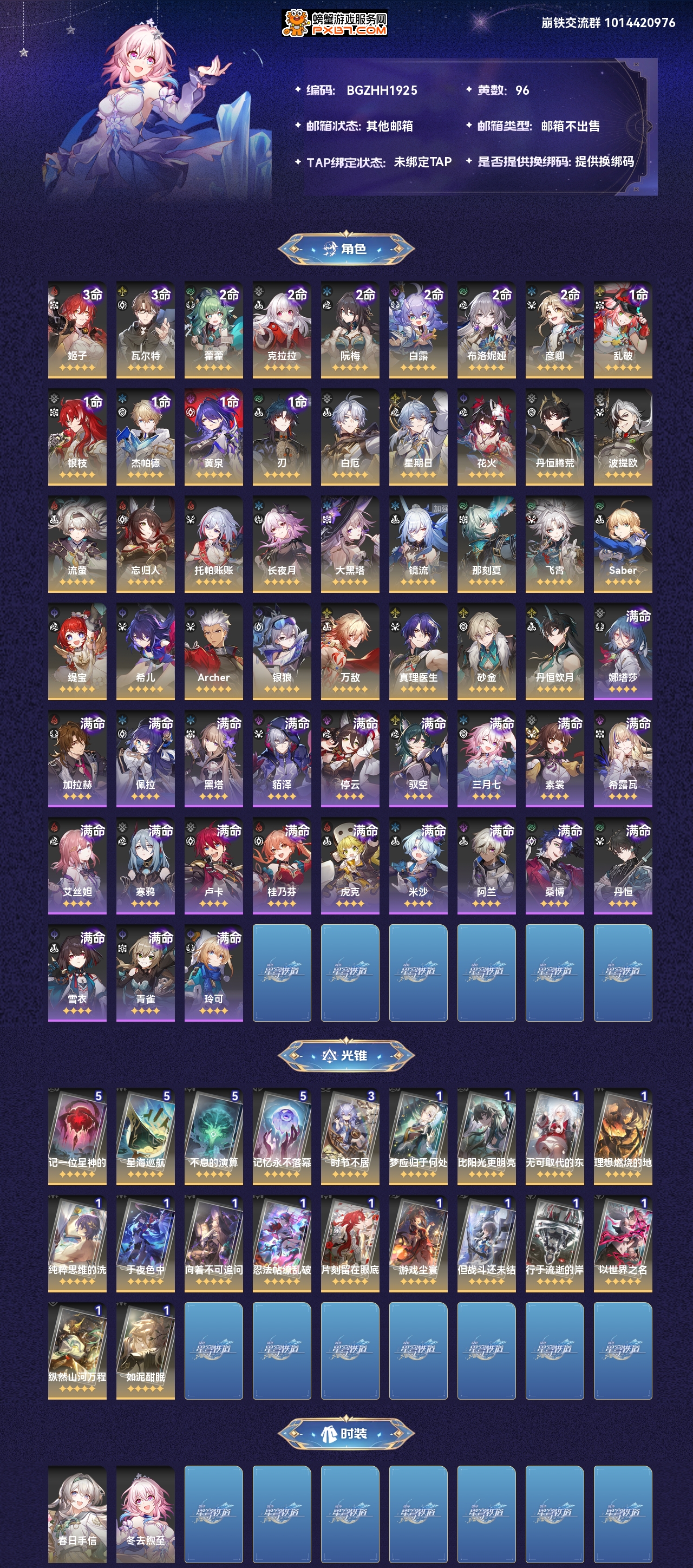 【崩坏·星穹铁道】【lyxq7555】冒险等级:70,女主,五星数量:55,绑定情况:邮箱__五星角色:姬子 3命|瓦尔特 3命|藿藿 2命|克拉拉 2命|阮·梅 2命|白露 2命|布洛妮娅 2命|彦卿 2命|乱破 1命|银枝 1命|杰帕德 1命|黄泉 1命|刃 1命|白厄|星期日|花火|丹恒·腾荒|波提欧|流萤|忘归人|托帕账账|长夜月|大黑塔|镜流|那刻夏|飞霄|saber|缇宝|希儿|archer|银狼|万敌|真理医生|砂金|丹恒·饮月__五星光锥:记一位星神的陨落 5精|星海巡航 5精|不息的演算 5精|记忆永不落幕 5精|时节不居 3精|梦应归于何处|比阳光更明亮的|无可取代的东西|理想燃烧的地狱|纯粹思维的洗礼|于夜色中|向着不可追问处|忍法帖·缭乱破魔|片刻,留在眼底|游戏尘寰|但战斗还未结束|行于流逝的岸|以世界之名|纵然山河万程|如泥酣眠,【邮箱不出售】