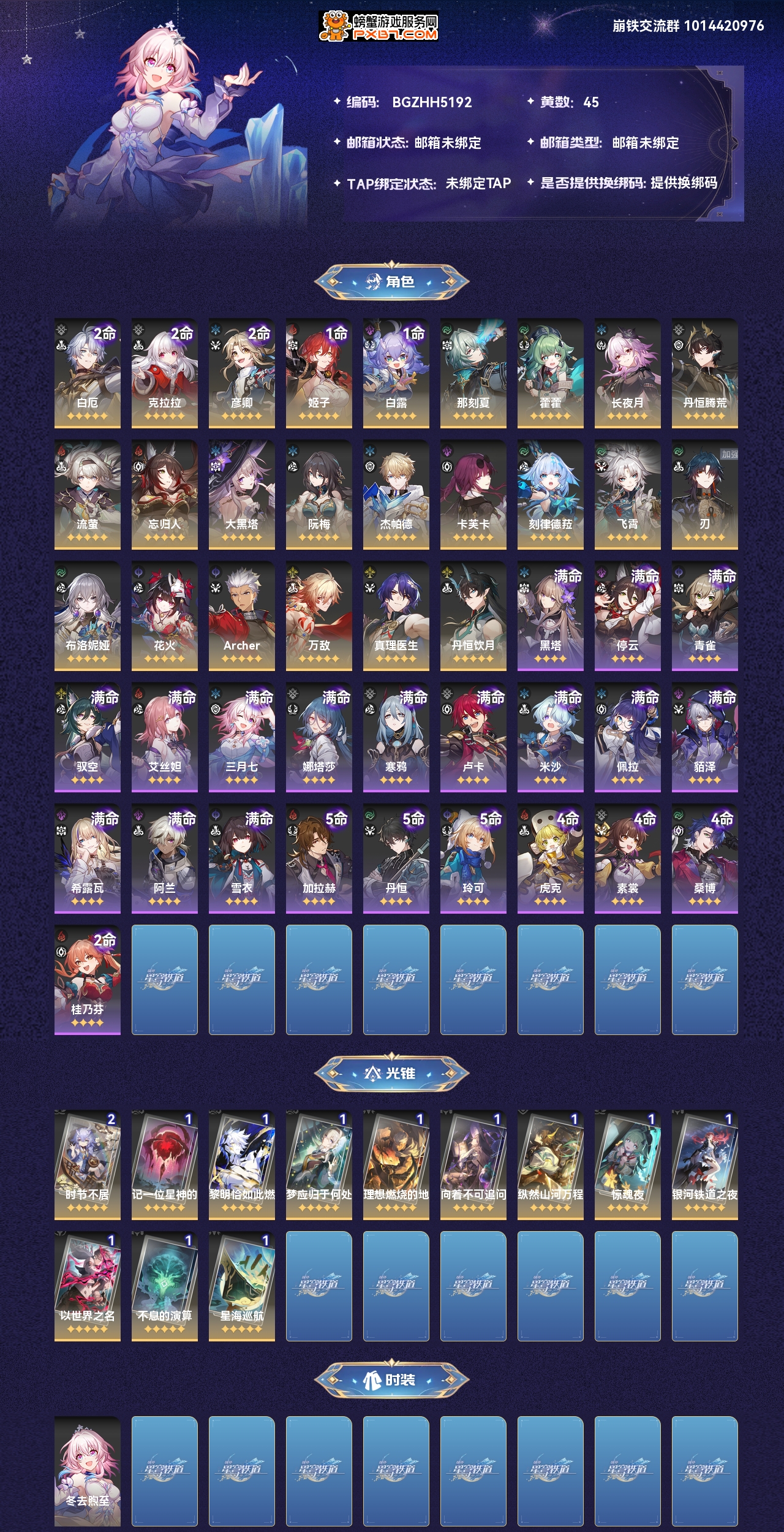 【崩坏·星穹铁道】【lyxq7583】冒险等级:70,男主,五星数量:36,绑定情况:手机号__五星角色:白厄 2命|克拉拉 2命|彦卿 2命|姬子 1命|白露 1命|那刻夏|藿藿|长夜月|丹恒·腾荒|流萤|忘归人|大黑塔|阮·梅|杰帕德|卡芙卡|刻律德菈|飞霄|刃|布洛妮娅|花火|archer|万敌|真理医生|丹恒·饮月__五星光锥:时节不居 2精|记一位星神的陨落|黎明恰如此燃烧|梦应归于何处|理想燃烧的地狱|向着不可追问处|纵然山河万程|惊魂夜|银河铁道之夜|以世界之名|不息的演算|星海巡航,【邮箱未绑定】
