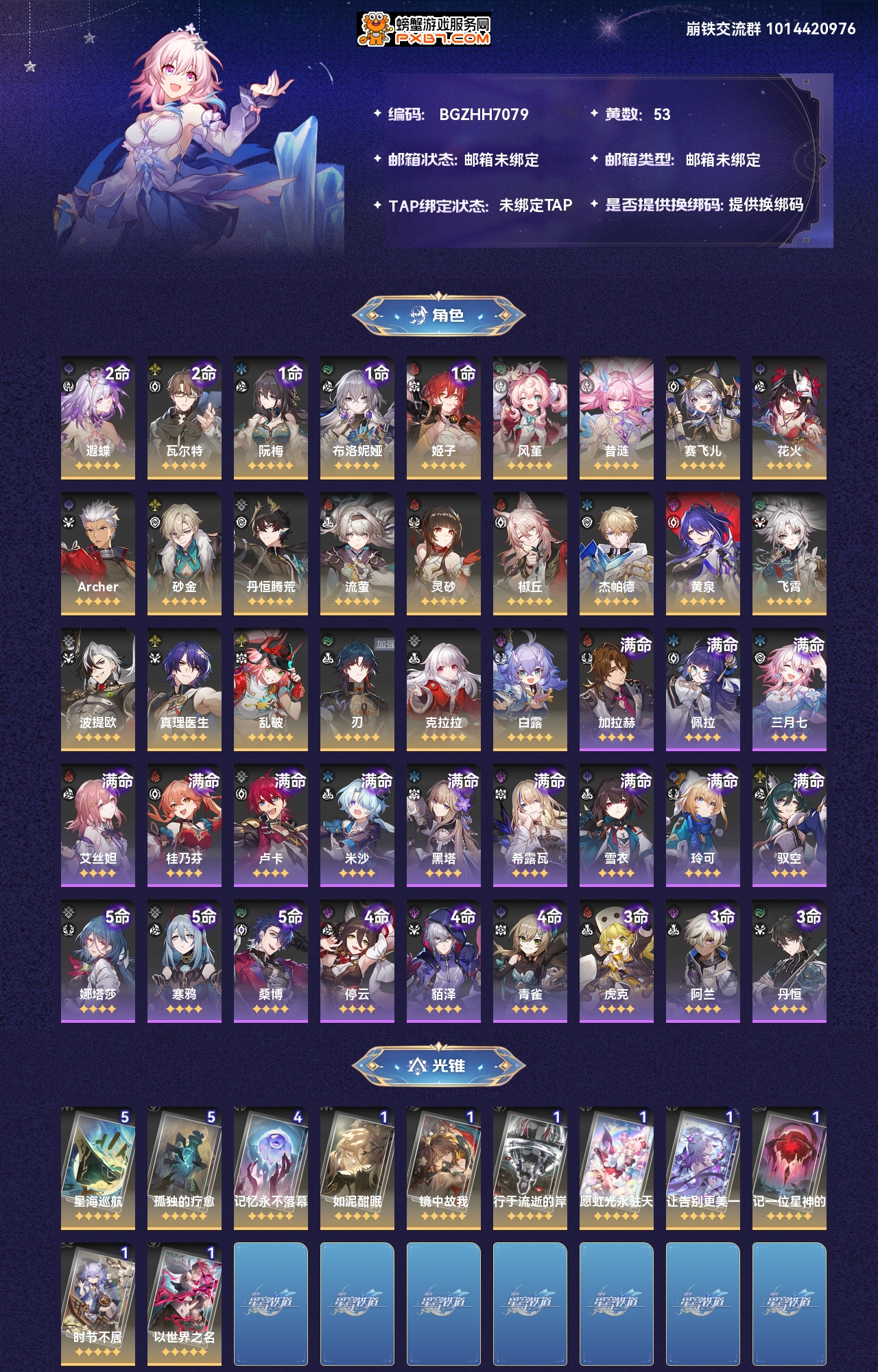 【崩坏·星穹铁道】【lyxq7576】冒险等级:70,男主,五星数量:35,绑定情况:手机号__五星角色:遐蝶 2命|瓦尔特 2命|阮·梅 1命|布洛妮娅 1命|姬子 1命|风堇|昔涟|赛飞儿|花火|archer|砂金|丹恒·腾荒|流萤|灵砂|椒丘|杰帕德|黄泉|飞霄|波提欧|真理医生|乱破|刃|克拉拉|白露__五星光锥:星海巡航 5精|孤独的疗愈 5精|记忆永不落幕 4精|如泥酣眠|镜中故我|行于流逝的岸|愿虹光永驻天空|让告别,更美一些|记一位星神的陨落|时节不居|以世界之名,【邮箱未绑定】