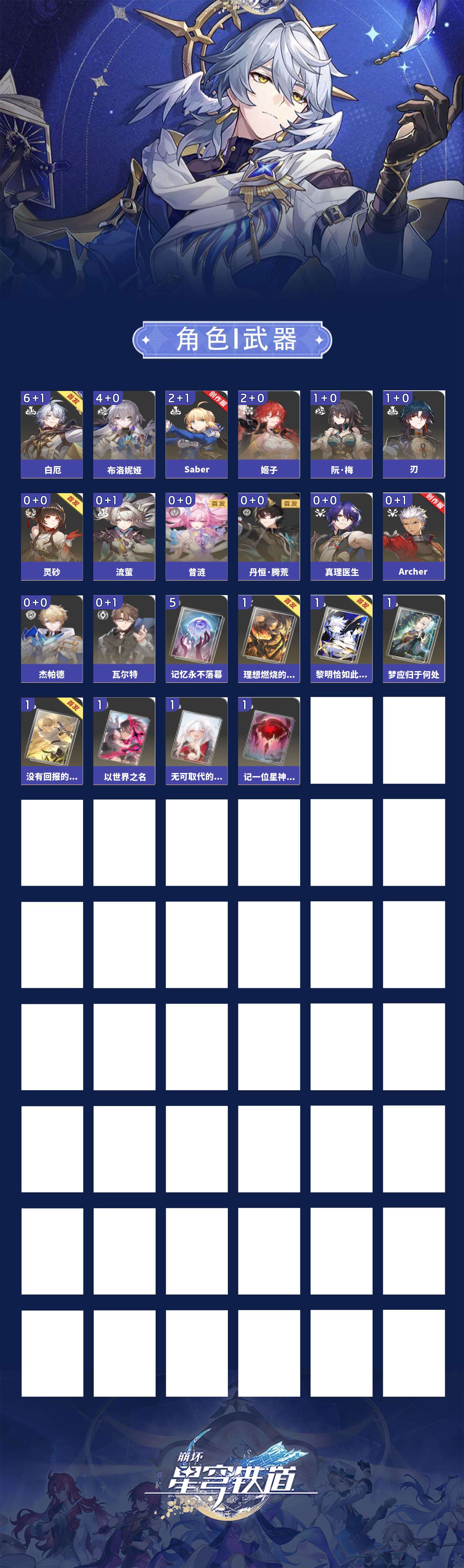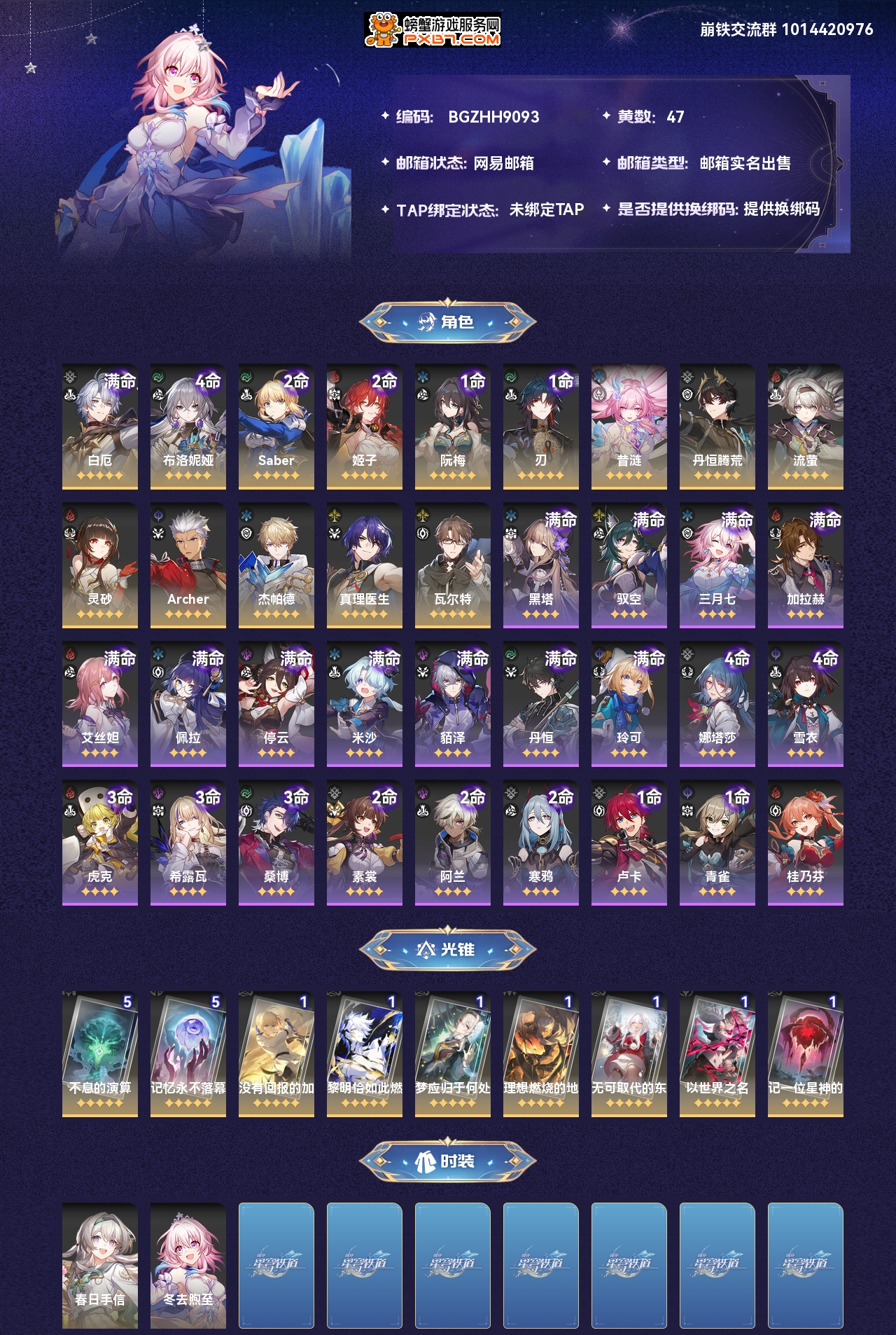 【崩坏·星穹铁道】【lyxq7527】冒险等级:70,女主,五星数量:23,绑定情况:邮箱__五星角色:白厄 6命|布洛妮娅 4命|saber 2命|姬子 2命|阮·梅 1命|刃 1命|昔涟|丹恒·腾荒|流萤|灵砂|archer|杰帕德|真理医生|瓦尔特__五星光锥:不息的演算 5精|记忆永不落幕 5精|没有回报的加冕|黎明恰如此燃烧|梦应归于何处|理想燃烧的地狱|无可取代的东西|以世界之名|记一位星神的陨落,【邮箱已实名】