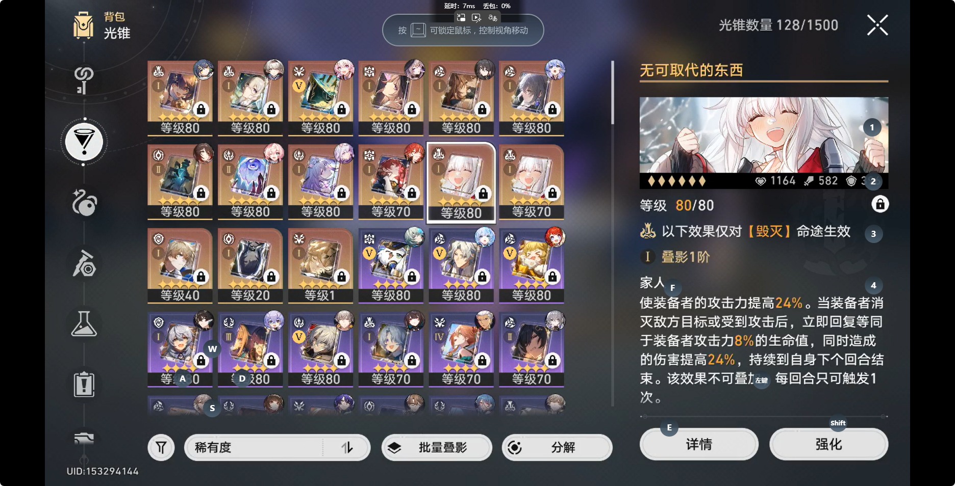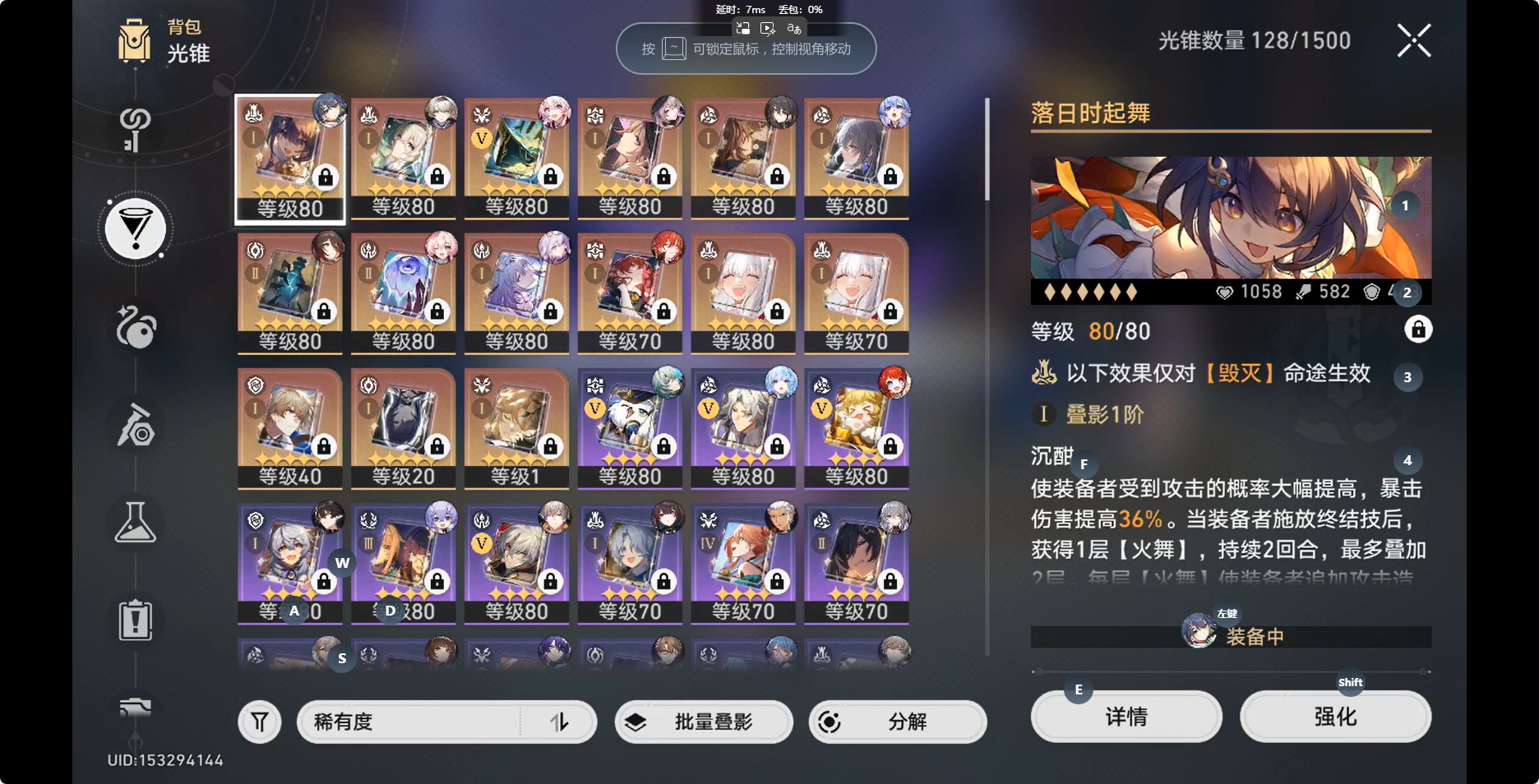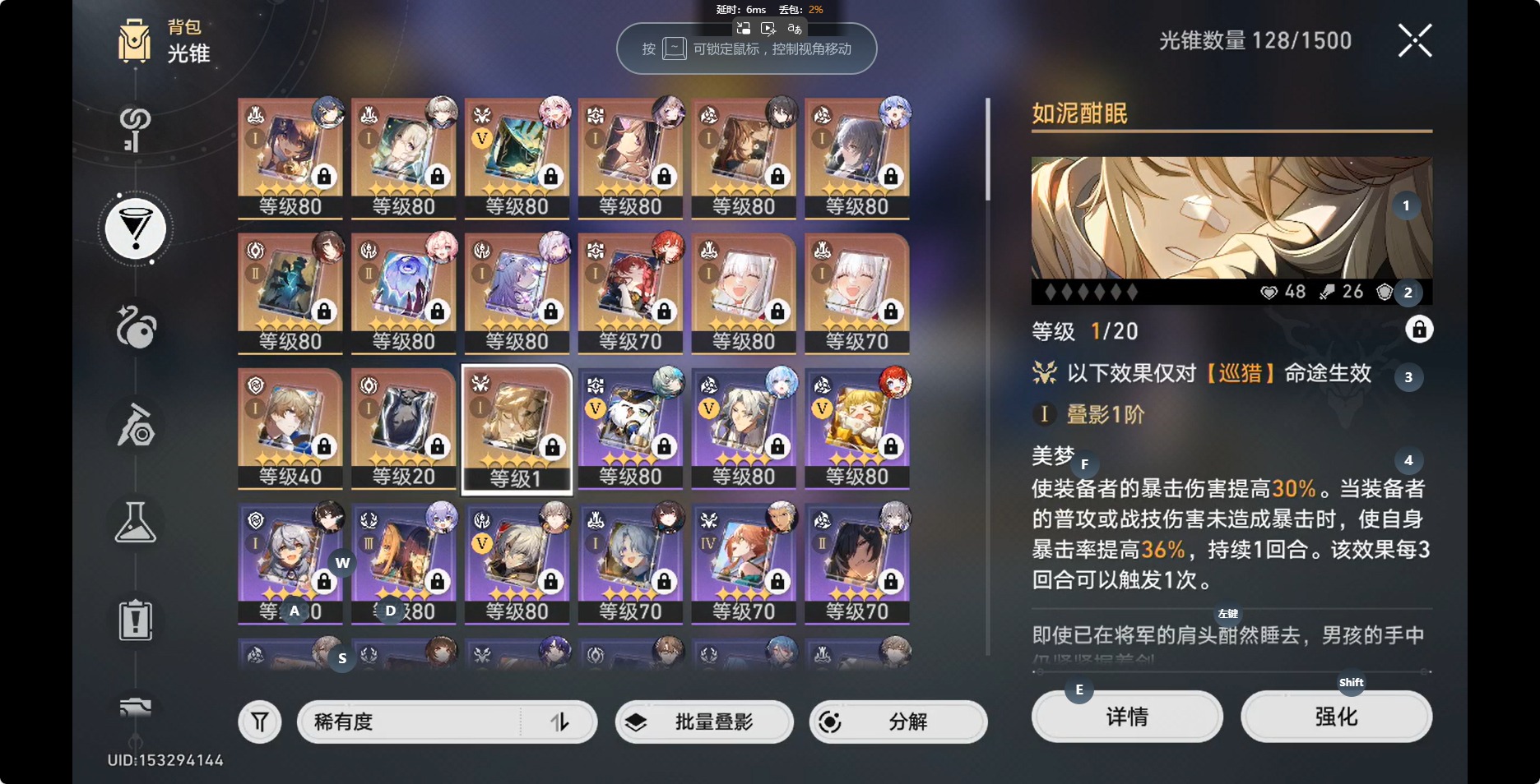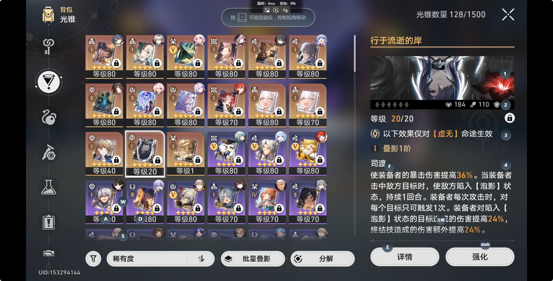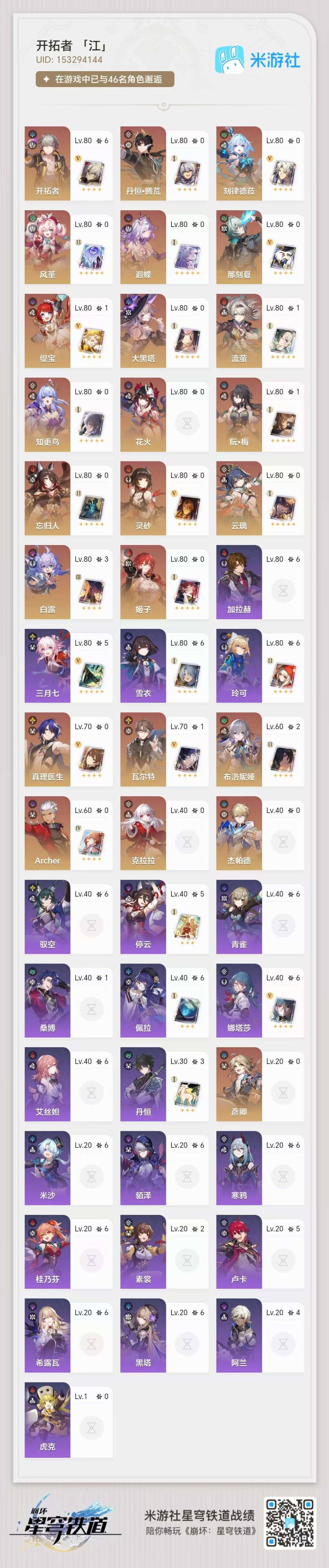 [14350191]【总黄数】:36 【3命金色角色】:3命白露 【2命金色角色】:2命布洛妮娅 【1命金色角色】:1命缇宝1命流萤1命瓦尔特1命阮•梅 【0命金色角色】:0命灵砂0命云璃0命忘归人0命大黑塔0命遐蝶0命那刻夏0命风堇0命archer0命刻律德菈0命丹恒·腾荒0命彦卿0命姬子0命克拉拉0命杰帕德0命知更鸟0命真理医生0命花火 【精5武器】:精5星海巡航 【精2武器】:精2孤独的疗愈 【精1武器】:精1落日时起舞精1向着不可追问处精1让告别,更美一些精1梦应归于何处精1如泥酣眠精1制胜的瞬间精1但战斗还未结束精1无可取代的东西精1银河铁道之夜精1镜中故我精1行于流逝的岸