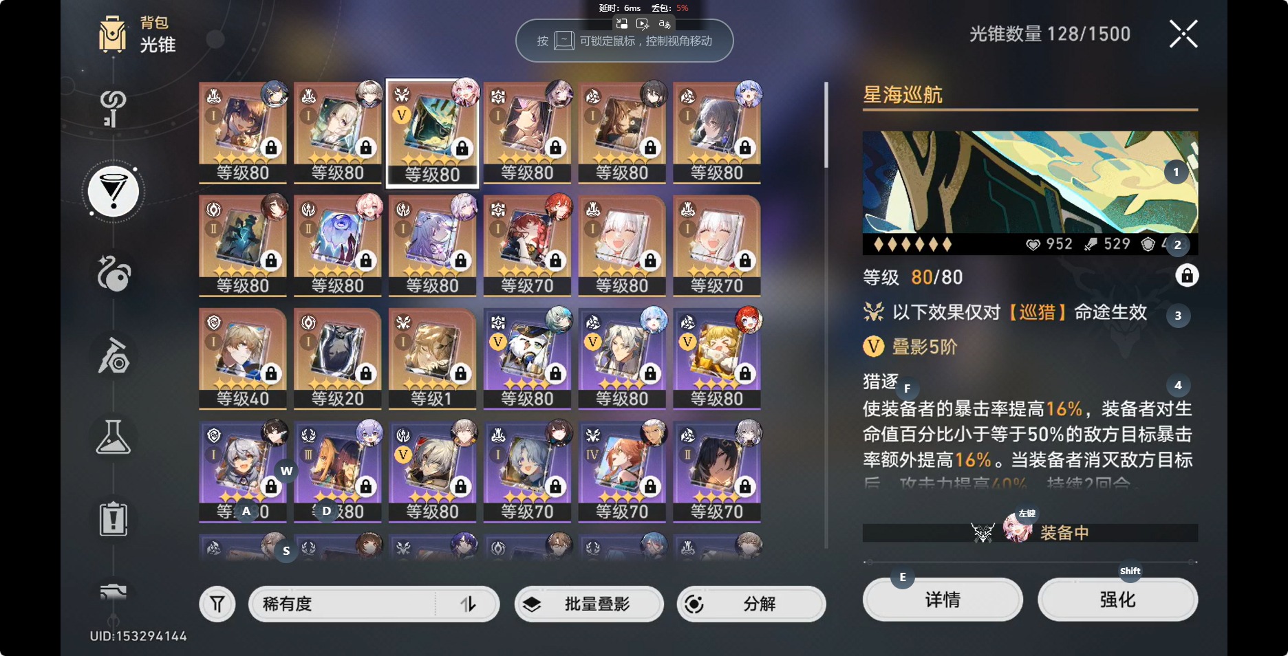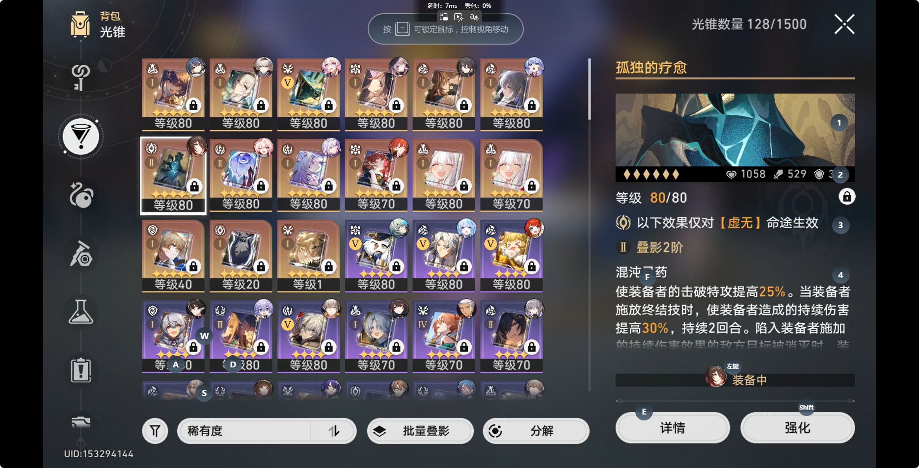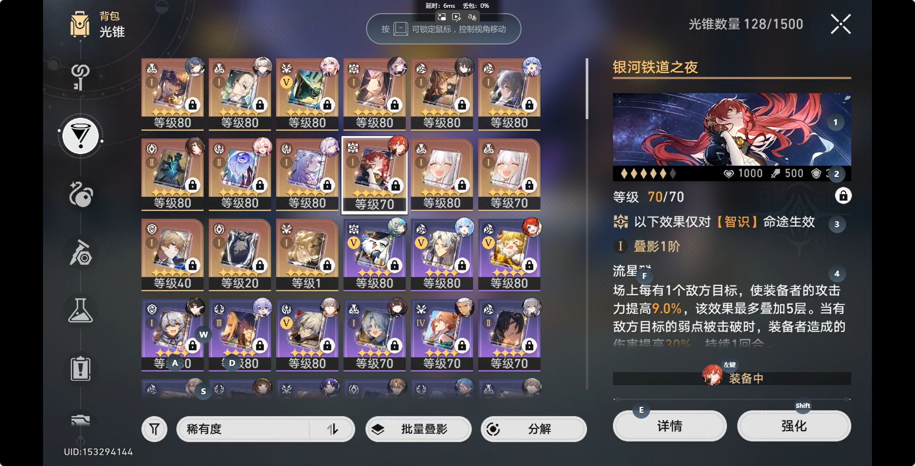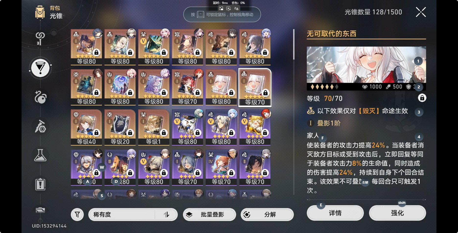 [14350191]【总黄数】:36 【3命金色角色】:3命白露 【2命金色角色】:2命布洛妮娅 【1命金色角色】:1命缇宝1命流萤1命瓦尔特1命阮•梅 【0命金色角色】:0命灵砂0命云璃0命忘归人0命大黑塔0命遐蝶0命那刻夏0命风堇0命archer0命刻律德菈0命丹恒·腾荒0命彦卿0命姬子0命克拉拉0命杰帕德0命知更鸟0命真理医生0命花火 【精5武器】:精5星海巡航 【精2武器】:精2孤独的疗愈 【精1武器】:精1落日时起舞精1向着不可追问处精1让告别,更美一些精1梦应归于何处精1如泥酣眠精1制胜的瞬间精1但战斗还未结束精1无可取代的东西精1银河铁道之夜精1镜中故我精1行于流逝的岸