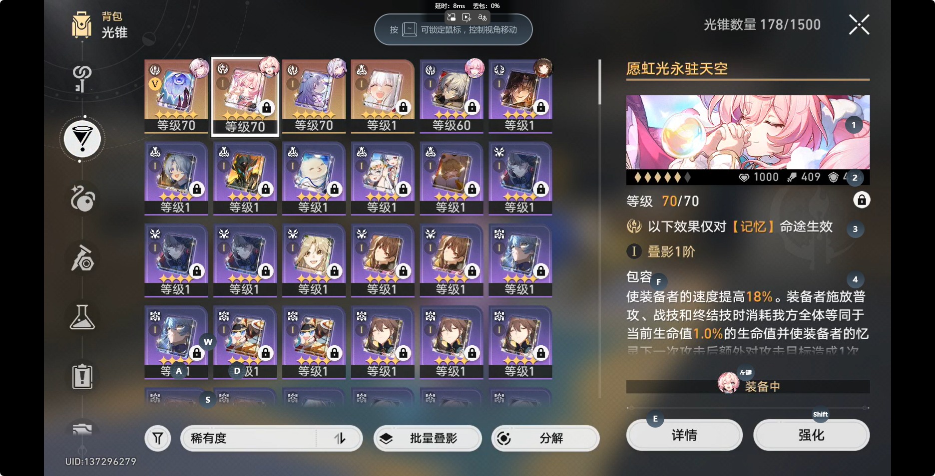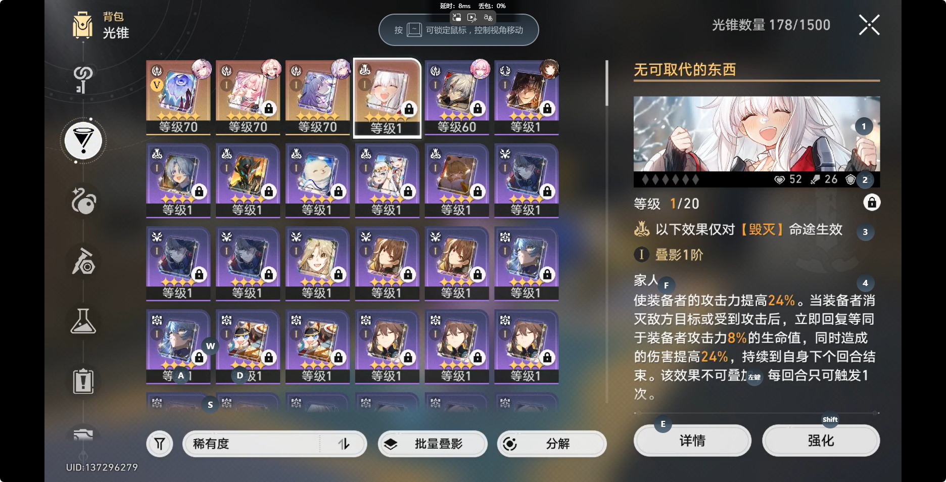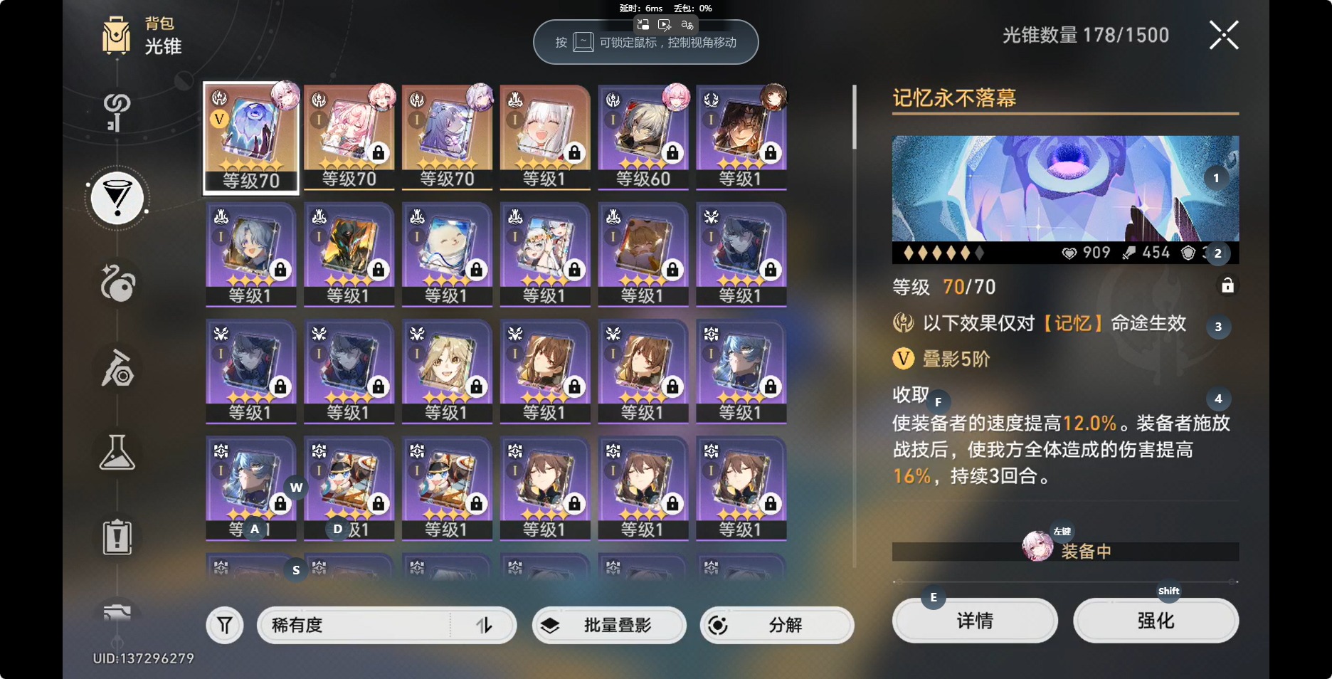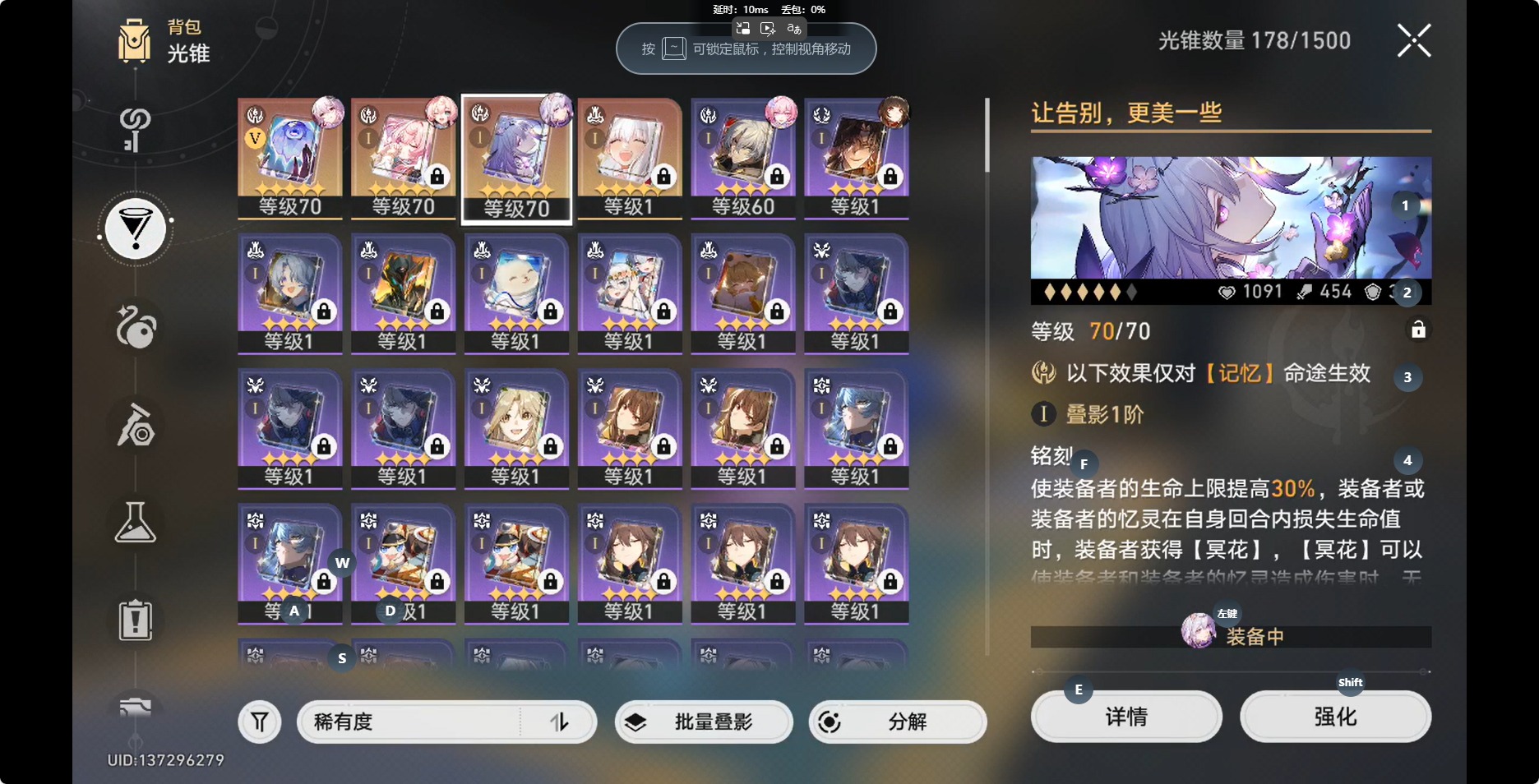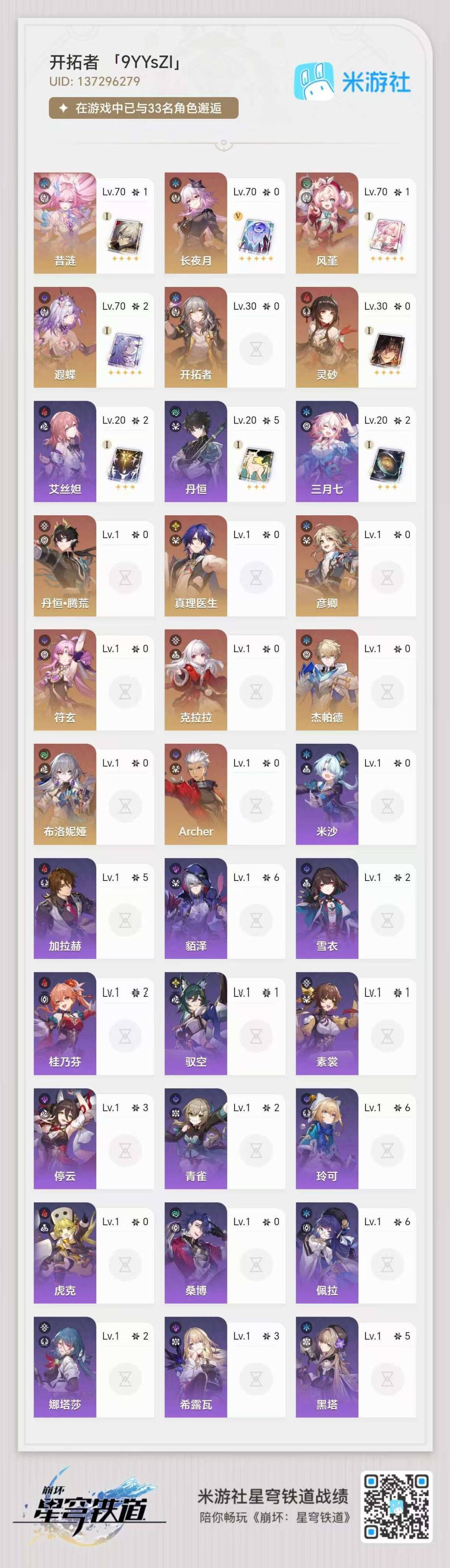 [14350194]【总黄数】:20 【2命金色角色】:2命遐蝶 【1命金色角色】:1命风堇1命昔涟 【0命金色角色】:0命灵砂0命archer0命长夜月0命丹恒·腾荒0命彦卿0命布洛妮娅0命克拉拉0命杰帕德0命符玄0命真理医生 【精5武器】:精5记忆永不落幕 【精1武器】:精1让告别,更美一些精1愿虹光永驻天空精1无可取代的东西