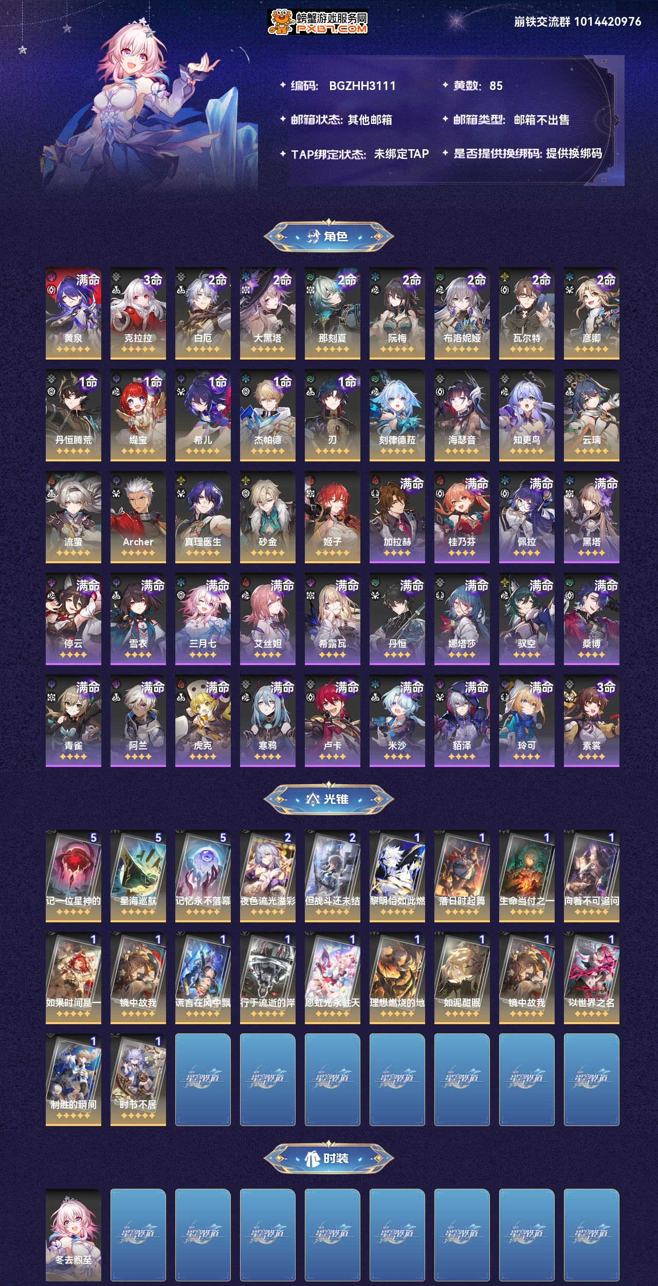 【崩坏·星穹铁道】【lyxq7541】冒险等级:70,女主,五星数量:42,绑定情况:邮箱__五星角色:黄泉 6命|克拉拉 3命|白厄 2命|大黑塔 2命|那刻夏 2命|阮·梅 2命|布洛妮娅 2命|瓦尔特 2命|彦卿 2命|丹恒·腾荒 1命|缇宝 1命|希儿 1命|杰帕德 1命|刃 1命|刻律德菈|海瑟音|知更鸟|云璃|流萤|archer|真理医生|砂金|姬子__五星光锥:记一位星神的陨落 5精|星海巡航 5精|记忆永不落幕 5精|夜色流光溢彩 2精|但战斗还未结束 2精|黎明恰如此燃烧|落日时起舞|生命当付之一炬|向着不可追问处|如果时间是一朵花|镜中故我|谎言在风中飘扬|行于流逝的岸|愿虹光永驻天空|理想燃烧的地狱|如泥酣眠|以世界之名|制胜的瞬间|时节不居,【邮箱不出售】