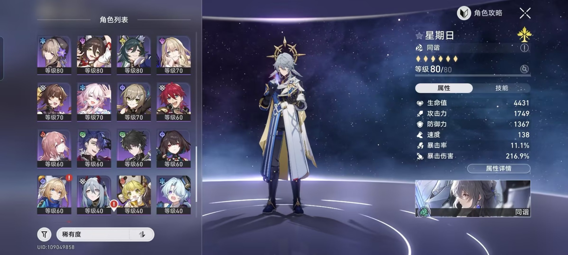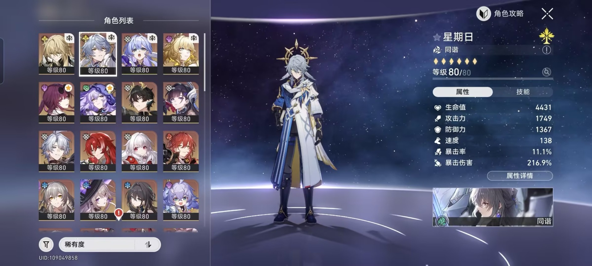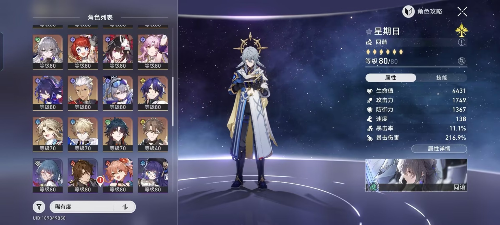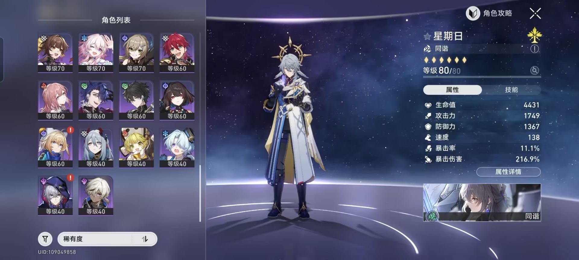 [14359072]【总黄数】:45 【4命金色角色】:4命克拉拉 【2命金色角色】:2命彦卿2命布洛妮娅 【1命金色角色】:1命阿格莱雅1命白露1命姬子1命刃1命黑天鹅 【0命金色角色】:0命希儿0命星期日0命大黑塔0命缇宝0命白厄0命archer0命海瑟音0命丹恒·腾荒0命卡芙卡0命瓦尔特0命杰帕德0命银狼0命罗刹0命知更鸟0命符玄0命银枝0命阮•梅0命真理医生0命花火 【精5武器】:精5记忆永不落幕精5记忆的质料精5孤独的疗愈精5记一位星神的陨落精5星海巡航 【精1武器】:精1不息的演算精1向着不可追问处精1将光阴织成黄金精1理想燃烧的地狱精1海洋为何而歌精1时节不居精1但战斗还未结束精1银河铁道之夜精1重塑时光之忆精1行于流逝的岸