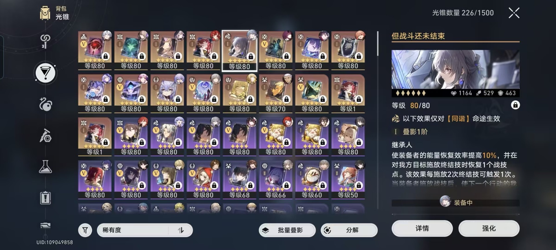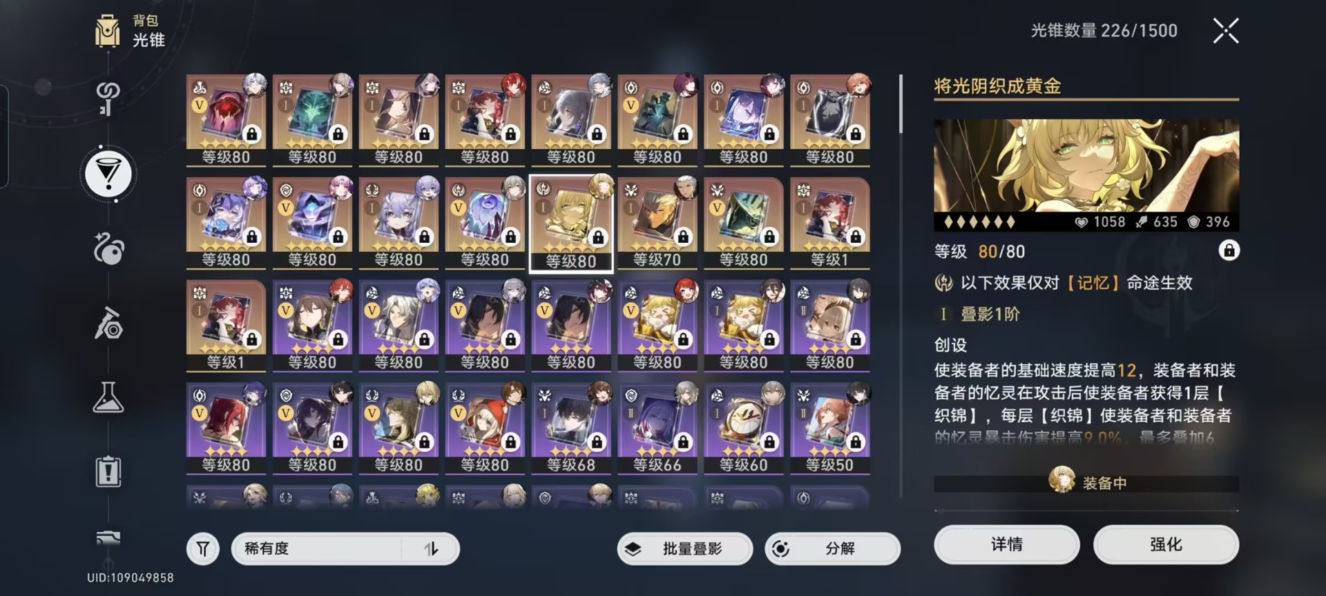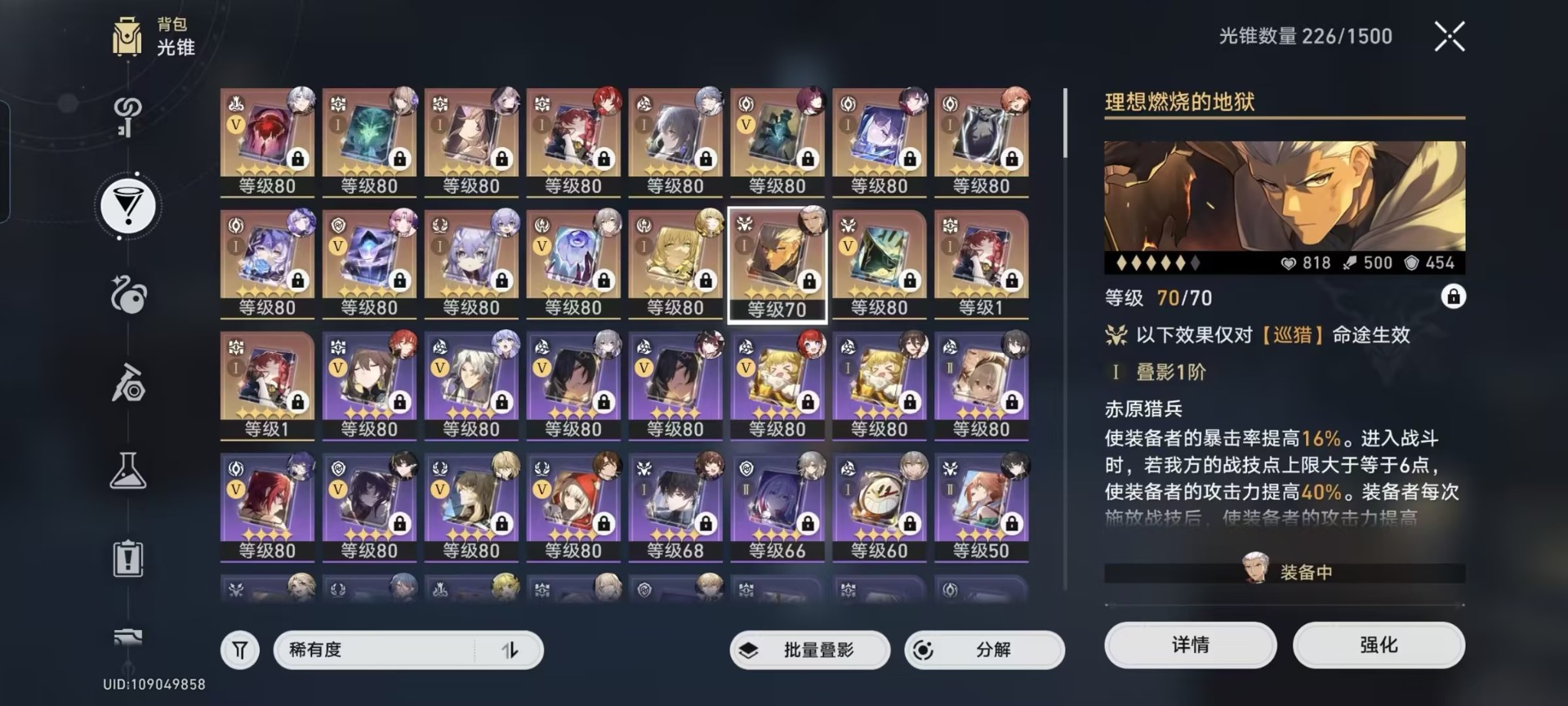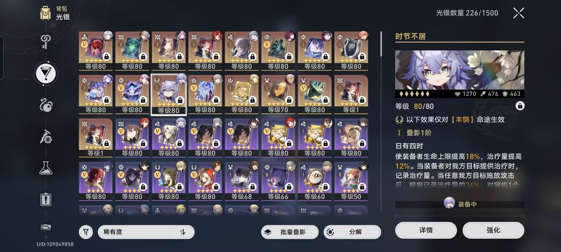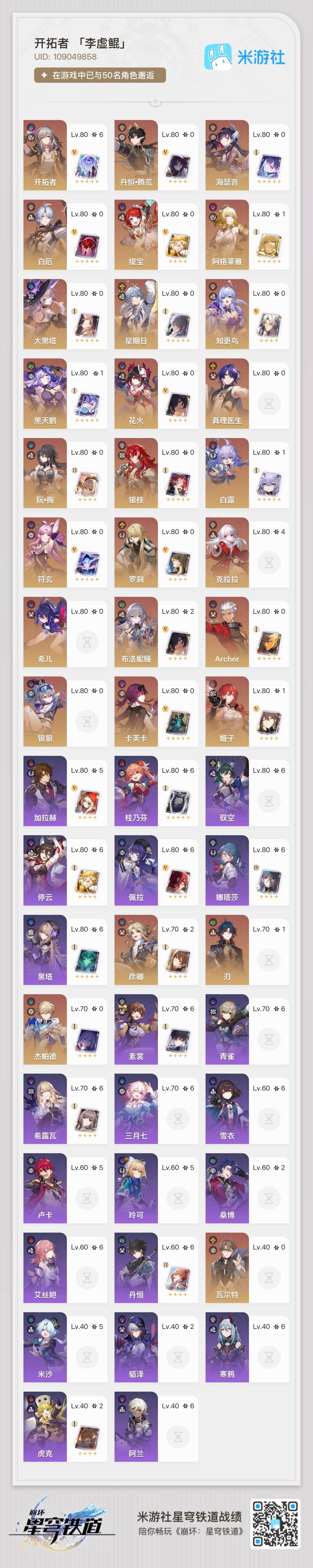 [14359072]【总黄数】:45 【4命金色角色】:4命克拉拉 【2命金色角色】:2命彦卿2命布洛妮娅 【1命金色角色】:1命阿格莱雅1命白露1命姬子1命刃1命黑天鹅 【0命金色角色】:0命希儿0命星期日0命大黑塔0命缇宝0命白厄0命archer0命海瑟音0命丹恒·腾荒0命卡芙卡0命瓦尔特0命杰帕德0命银狼0命罗刹0命知更鸟0命符玄0命银枝0命阮•梅0命真理医生0命花火 【精5武器】:精5记忆永不落幕精5记忆的质料精5孤独的疗愈精5记一位星神的陨落精5星海巡航 【精1武器】:精1不息的演算精1向着不可追问处精1将光阴织成黄金精1理想燃烧的地狱精1海洋为何而歌精1时节不居精1但战斗还未结束精1银河铁道之夜精1重塑时光之忆精1行于流逝的岸