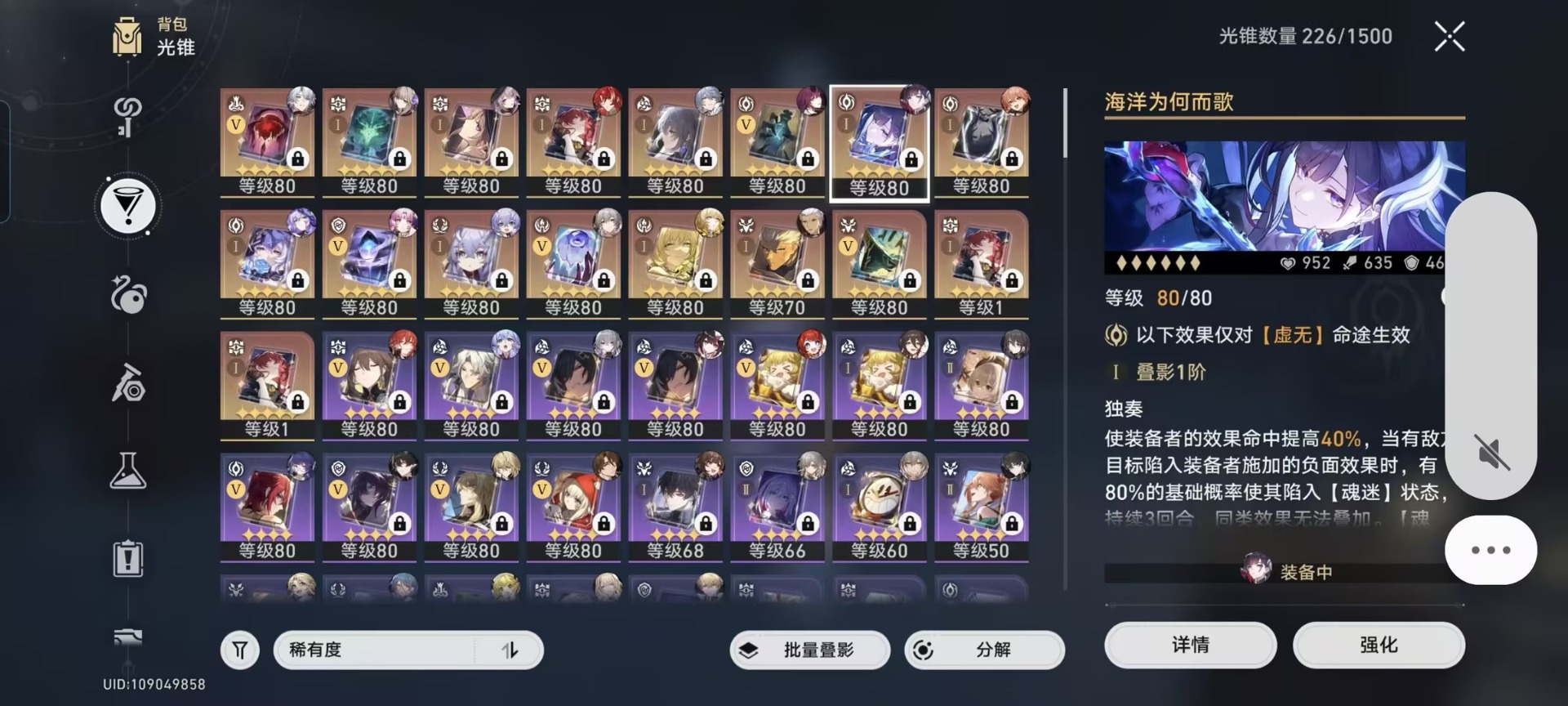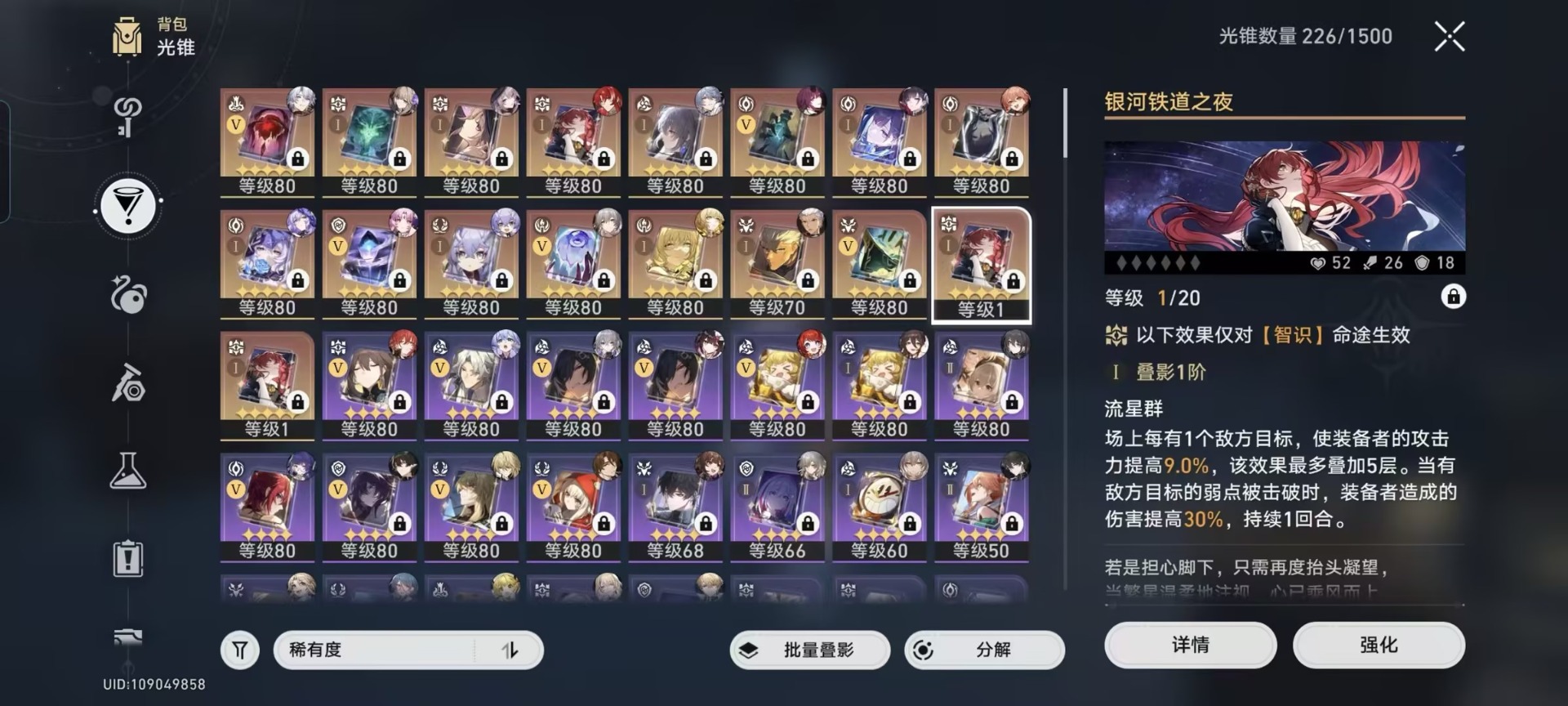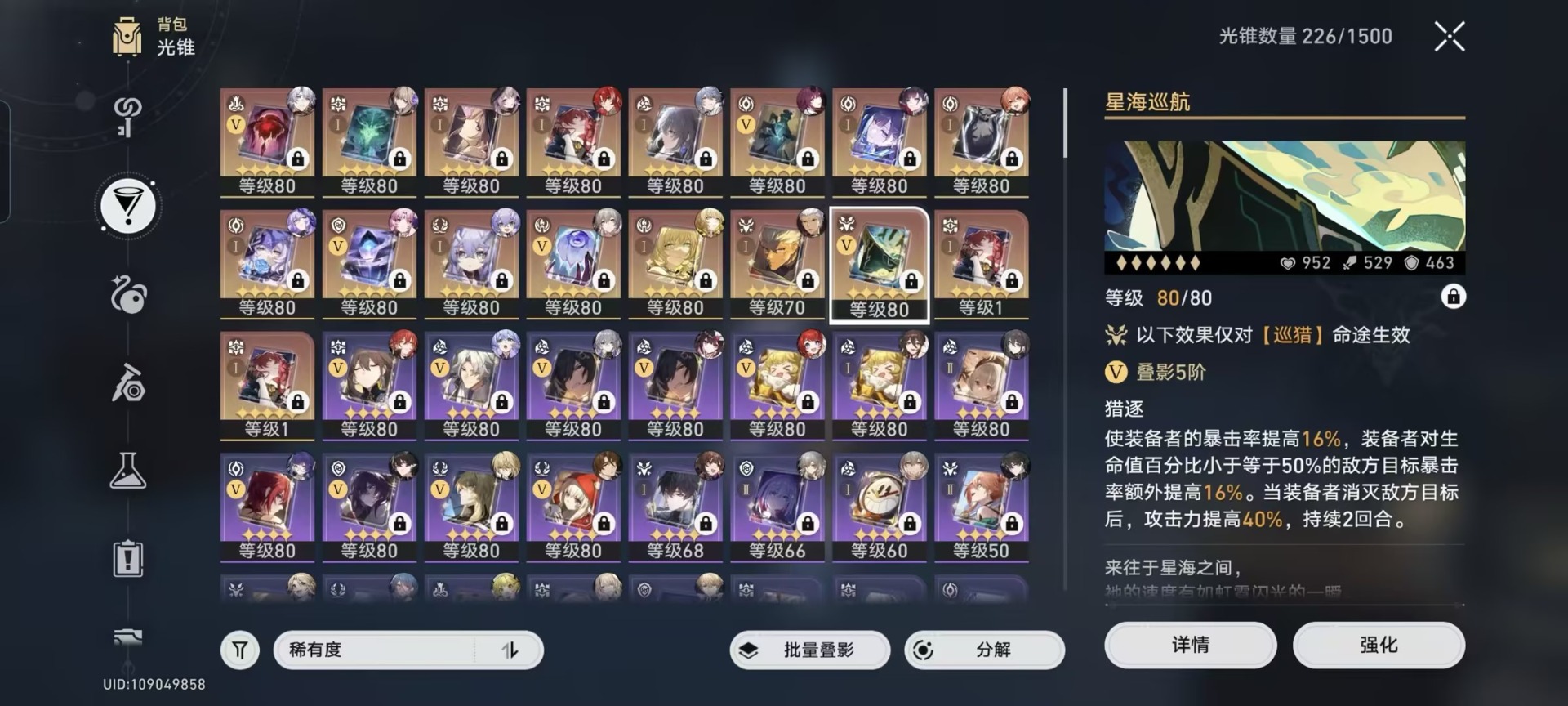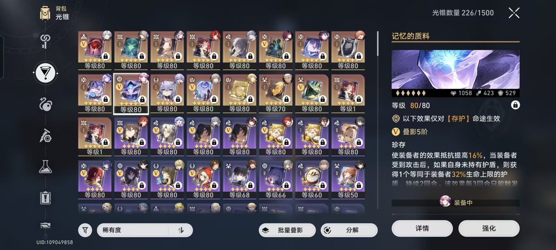 [14359072]【总黄数】:45 【4命金色角色】:4命克拉拉 【2命金色角色】:2命彦卿2命布洛妮娅 【1命金色角色】:1命阿格莱雅1命白露1命姬子1命刃1命黑天鹅 【0命金色角色】:0命希儿0命星期日0命大黑塔0命缇宝0命白厄0命archer0命海瑟音0命丹恒·腾荒0命卡芙卡0命瓦尔特0命杰帕德0命银狼0命罗刹0命知更鸟0命符玄0命银枝0命阮•梅0命真理医生0命花火 【精5武器】:精5记忆永不落幕精5记忆的质料精5孤独的疗愈精5记一位星神的陨落精5星海巡航 【精1武器】:精1不息的演算精1向着不可追问处精1将光阴织成黄金精1理想燃烧的地狱精1海洋为何而歌精1时节不居精1但战斗还未结束精1银河铁道之夜精1重塑时光之忆精1行于流逝的岸