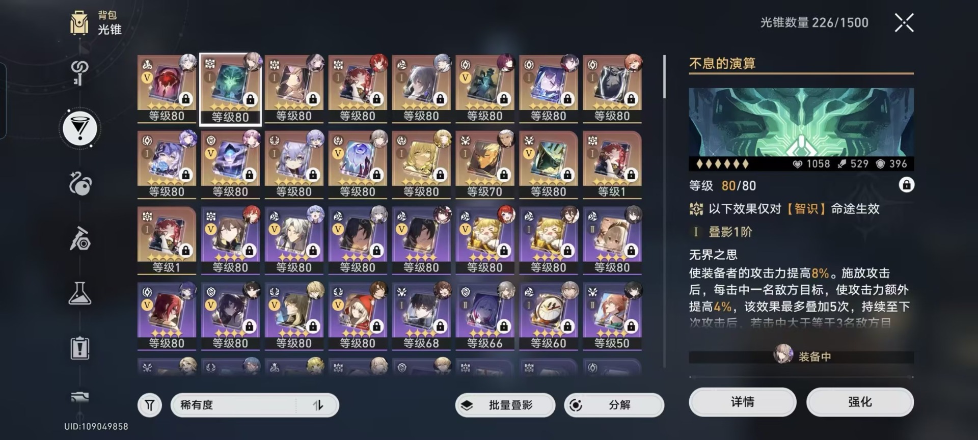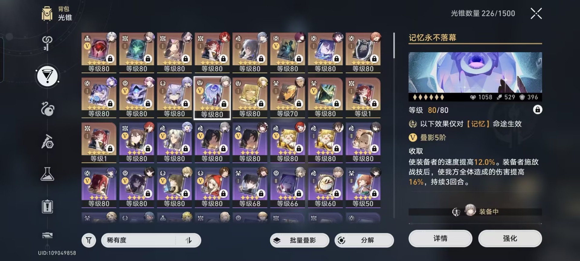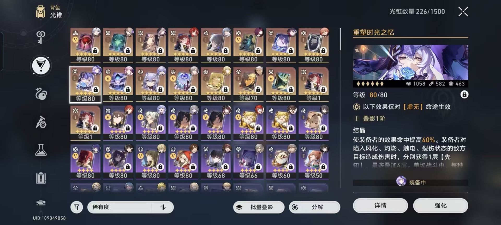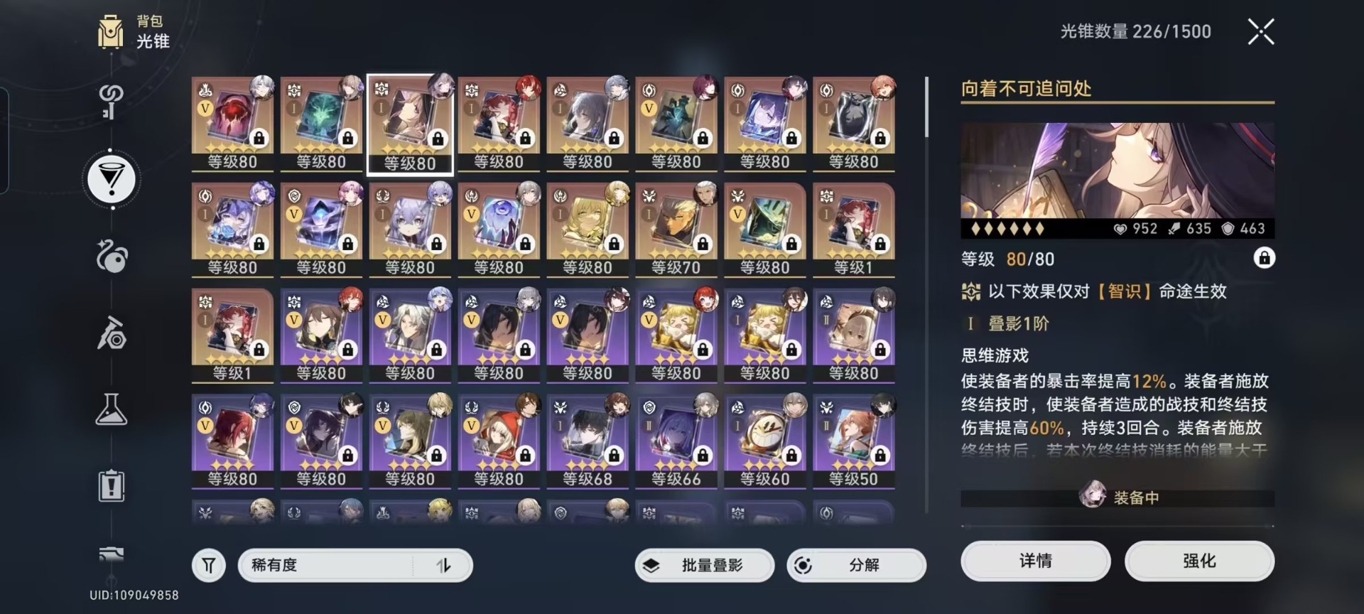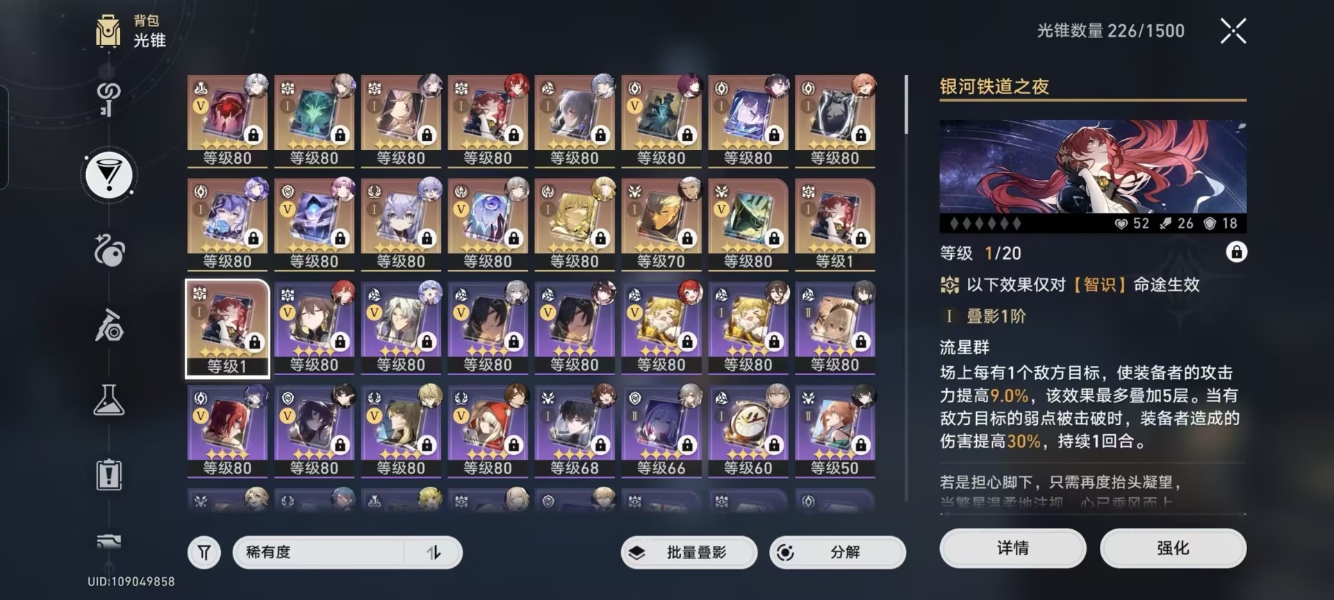 [14359072]【总黄数】:45 【4命金色角色】:4命克拉拉 【2命金色角色】:2命彦卿2命布洛妮娅 【1命金色角色】:1命阿格莱雅1命白露1命姬子1命刃1命黑天鹅 【0命金色角色】:0命希儿0命星期日0命大黑塔0命缇宝0命白厄0命archer0命海瑟音0命丹恒·腾荒0命卡芙卡0命瓦尔特0命杰帕德0命银狼0命罗刹0命知更鸟0命符玄0命银枝0命阮•梅0命真理医生0命花火 【精5武器】:精5记忆永不落幕精5记忆的质料精5孤独的疗愈精5记一位星神的陨落精5星海巡航 【精1武器】:精1不息的演算精1向着不可追问处精1将光阴织成黄金精1理想燃烧的地狱精1海洋为何而歌精1时节不居精1但战斗还未结束精1银河铁道之夜精1重塑时光之忆精1行于流逝的岸