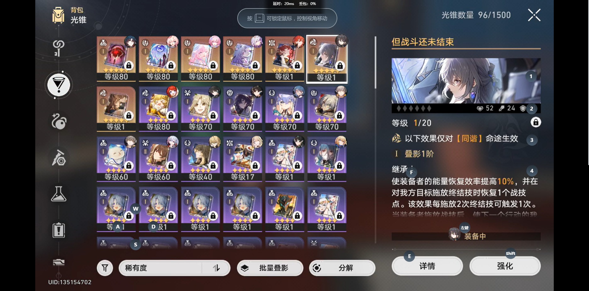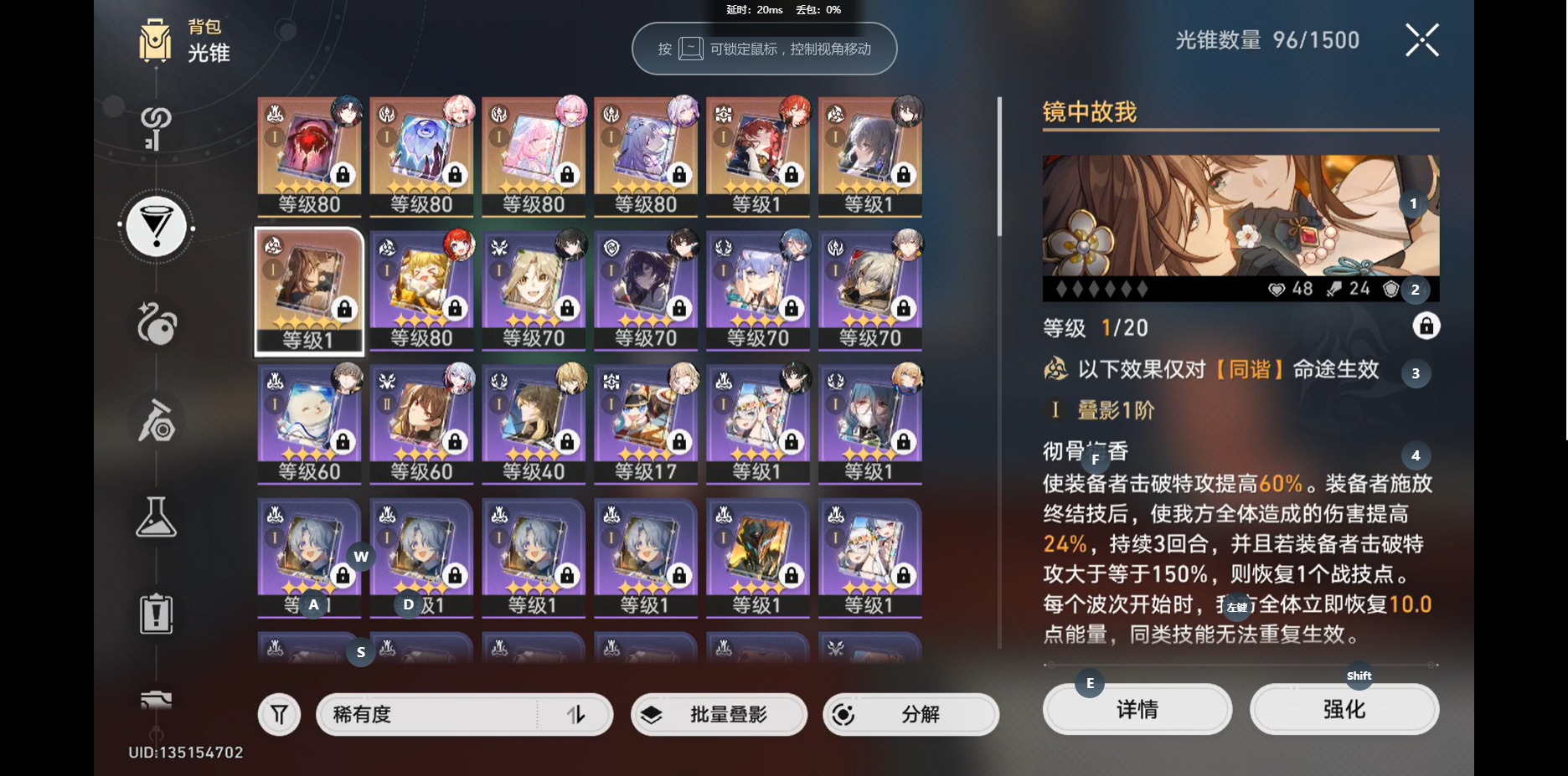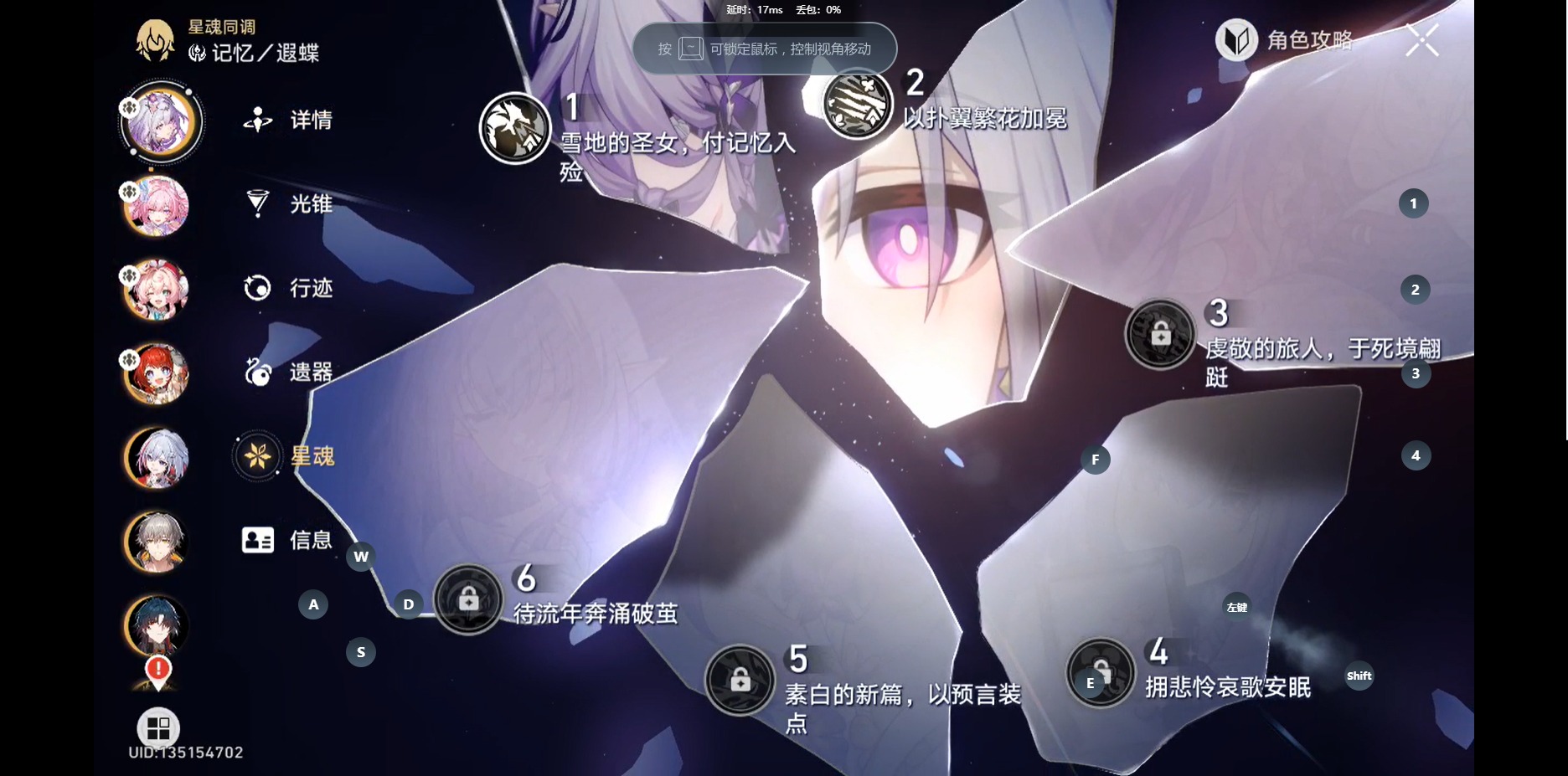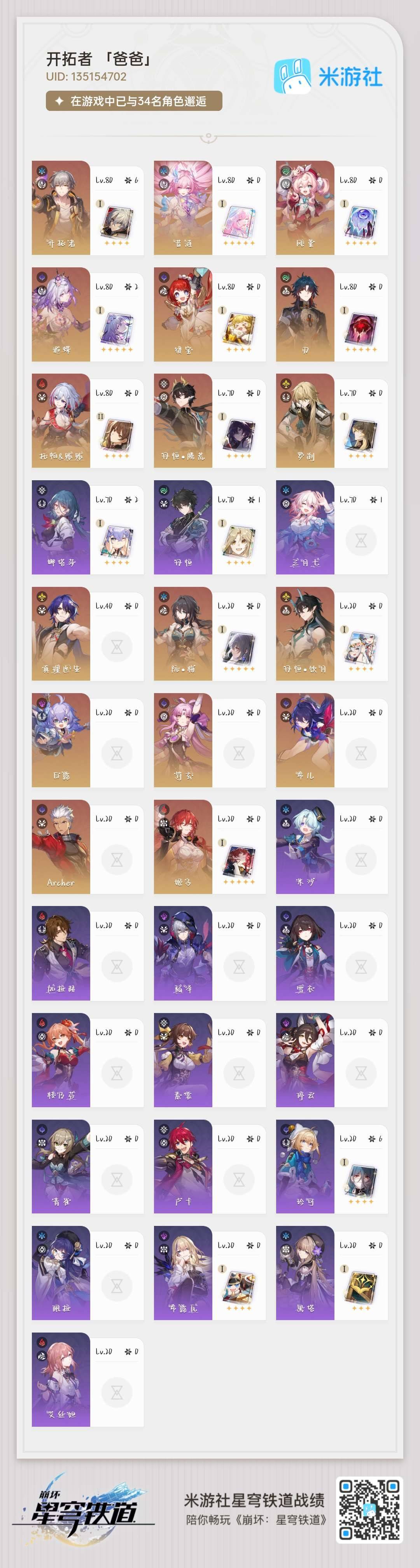 [14359133]【总黄数】:24 【2命金色角色】:2命遐蝶 【0命金色角色】:0命希儿0命缇宝0命风堇0命archer0命丹恒·腾荒0命白露0命姬子0命罗刹0命刃0命丹恒•饮月0命符玄0命托帕账账0命阮•梅0命真理医生0命昔涟 【精1武器】:精1记忆永不落幕精1让告别,更美一些精1但战斗还未结束精1银河铁道之夜精1记一位星神的陨落精1镜中故我精1爱如此刻永恒
