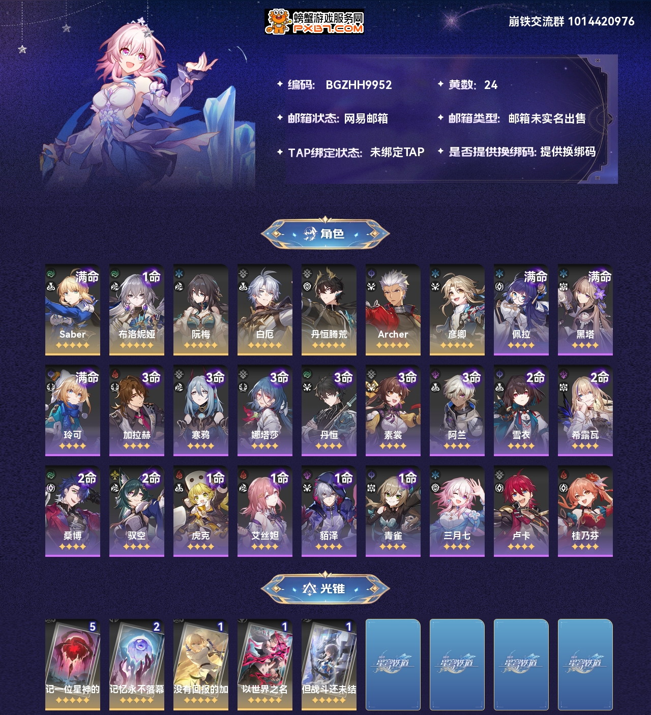 【崩坏·星穹铁道】【lyxq7614】冒险等级:65,女主,五星数量:12,绑定情况:邮箱__五星角色:saber 6命|布洛妮娅 1命|阮·梅|白厄|丹恒·腾荒|archer|彦卿__五星光锥:记一位星神的陨落 5精|记忆永不落幕 2精|没有回报的加冕|以世界之名|但战斗还未结束,【邮箱未实名】