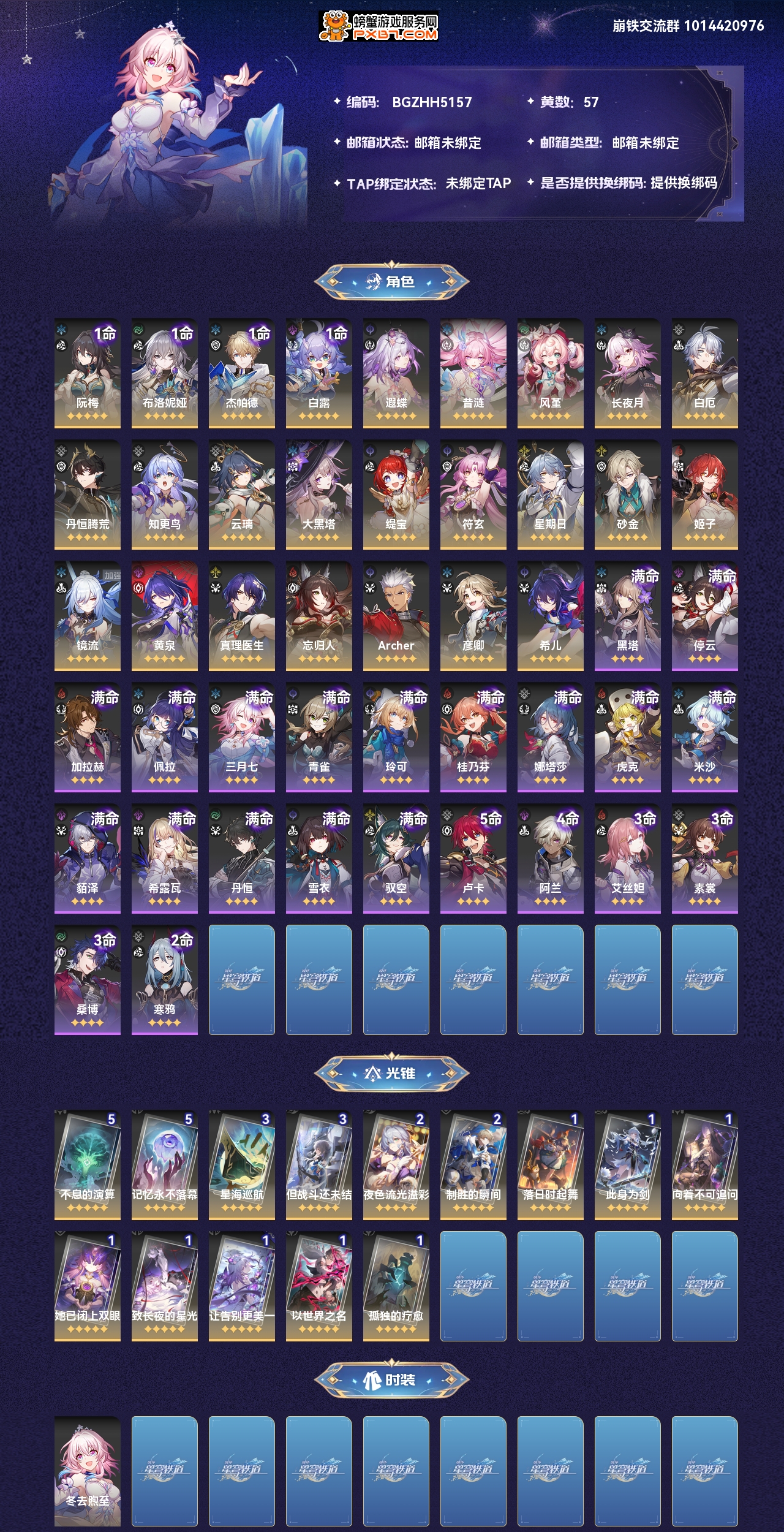 【崩坏·星穹铁道】【lyxq7610】冒险等级:70,女主,五星数量:39,绑定情况:手机号__五星角色:阮·梅 1命|布洛妮娅 1命|杰帕德 1命|白露 1命|遐蝶|昔涟|风堇|长夜月|白厄|丹恒·腾荒|知更鸟|云璃|大黑塔|缇宝|符玄|星期日|砂金|姬子|镜流|黄泉|真理医生|忘归人|archer|彦卿|希儿__五星光锥:不息的演算 5精|记忆永不落幕 5精|星海巡航 3精|但战斗还未结束 3精|夜色流光溢彩 2精|制胜的瞬间 2精|落日时起舞|此身为剑|向着不可追问处|她已闭上双眼|致长夜的星光|让告别,更美一些|以世界之名|孤独的疗愈,【邮箱未绑定】