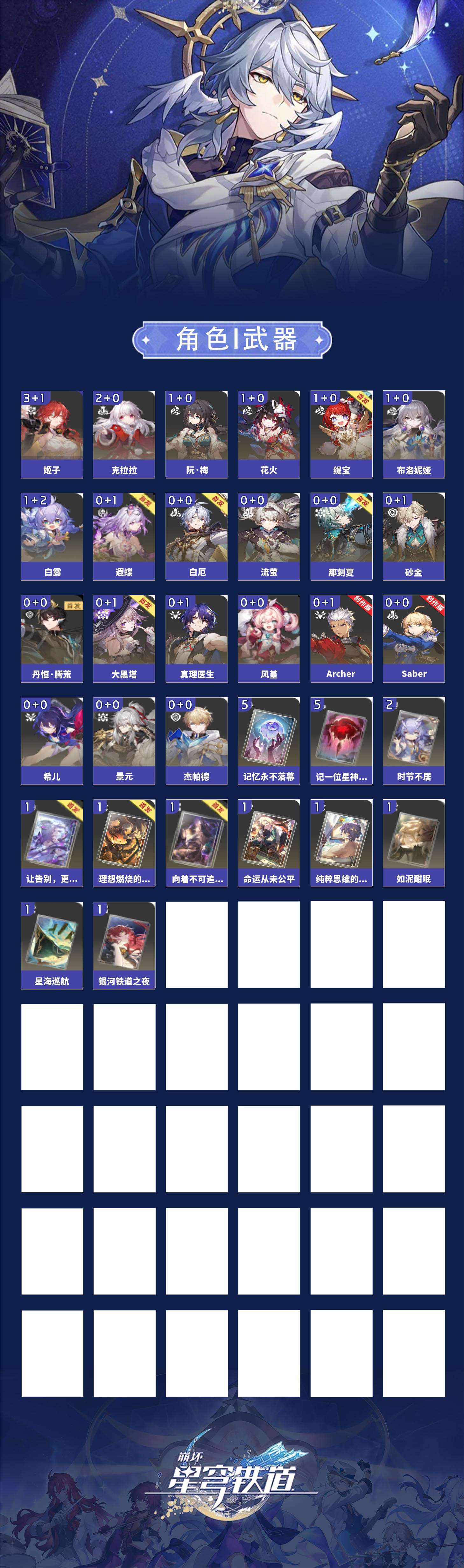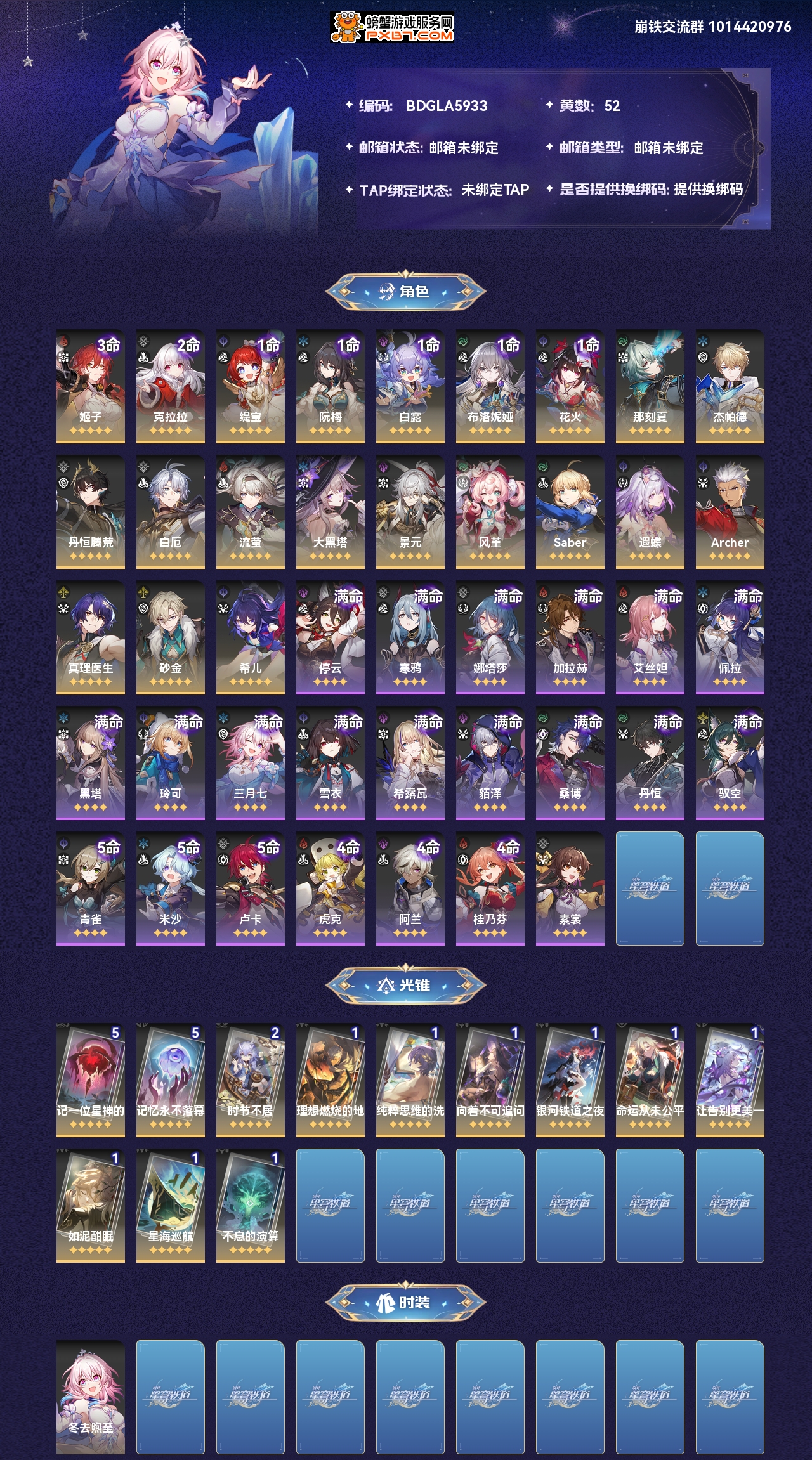 【崩坏·星穹铁道】【lyxq7637】冒险等级:70,男主,五星数量:33,绑定情况:手机号__五星角色:姬子 3命|克拉拉 2命|缇宝 1命|阮·梅 1命|白露 1命|布洛妮娅 1命|花火 1命|那刻夏|杰帕德|丹恒·腾荒|白厄|流萤|大黑塔|景元|风堇|saber|遐蝶|archer|真理医生|砂金|希儿__五星光锥:记一位星神的陨落 5精|记忆永不落幕 5精|时节不居 2精|理想燃烧的地狱|纯粹思维的洗礼|向着不可追问处|银河铁道之夜|命运从未公平|让告别,更美一些|如泥酣眠|星海巡航|不息的演算,【邮箱未绑定】