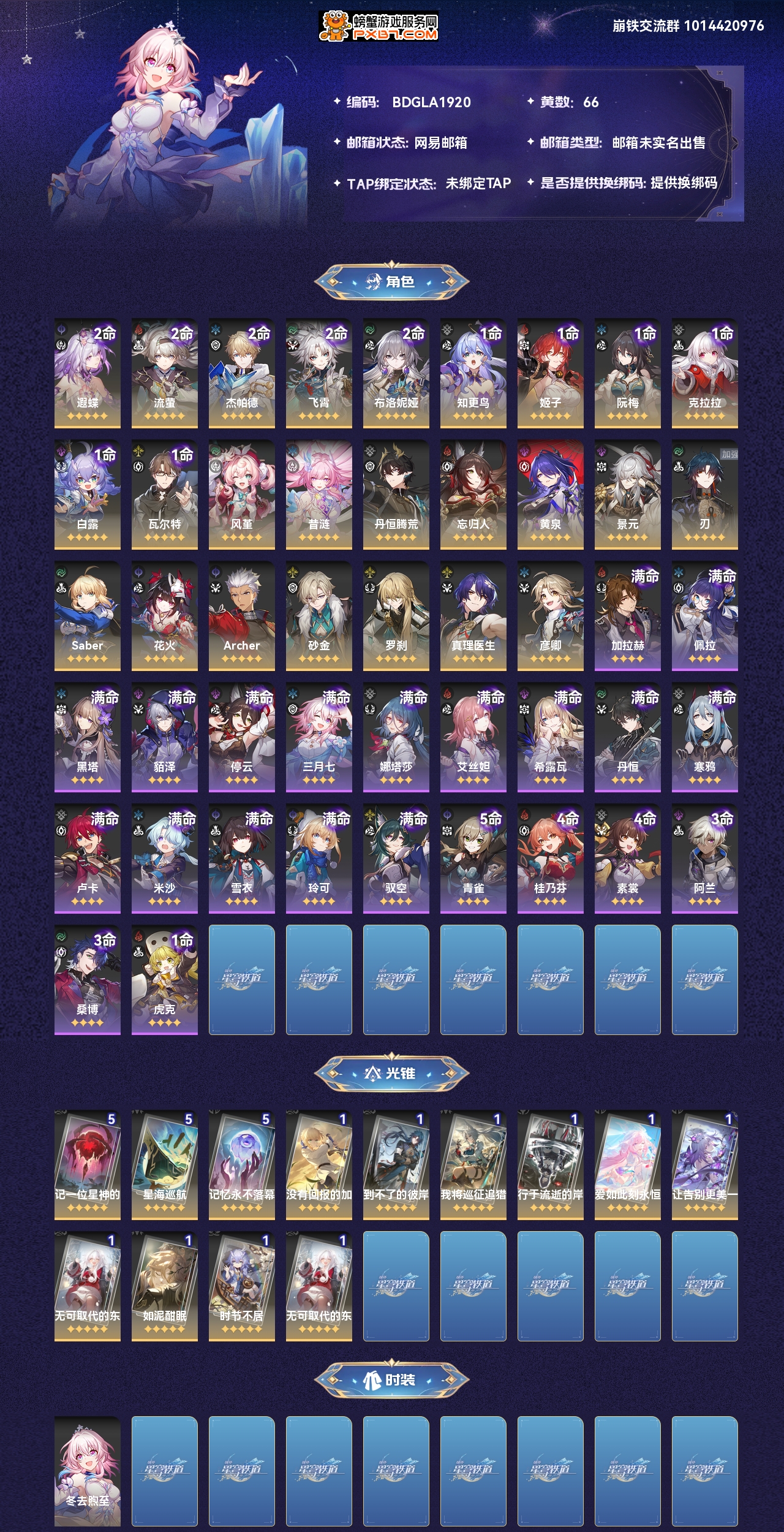 【崩坏·星穹铁道】【lyxq7625】冒险等级:70,女主,五星数量:37,绑定情况:邮箱__五星角色:遐蝶 2命|流萤 2命|杰帕德 2命|飞霄 2命|布洛妮娅 2命|知更鸟 1命|姬子 1命|阮·梅 1命|克拉拉 1命|白露 1命|瓦尔特 1命|风堇|昔涟|丹恒·腾荒|忘归人|黄泉|景元|刃|saber|花火|archer|砂金|罗刹|真理医生|彦卿__五星光锥:记一位星神的陨落 5精|星海巡航 5精|记忆永不落幕 5精|没有回报的加冕|到不了的彼岸|我将,巡征追猎|行于流逝的岸|爱如此刻永恒|让告别,更美一些|无可取代的东西|如泥酣眠|时节不居,【邮箱未实名】