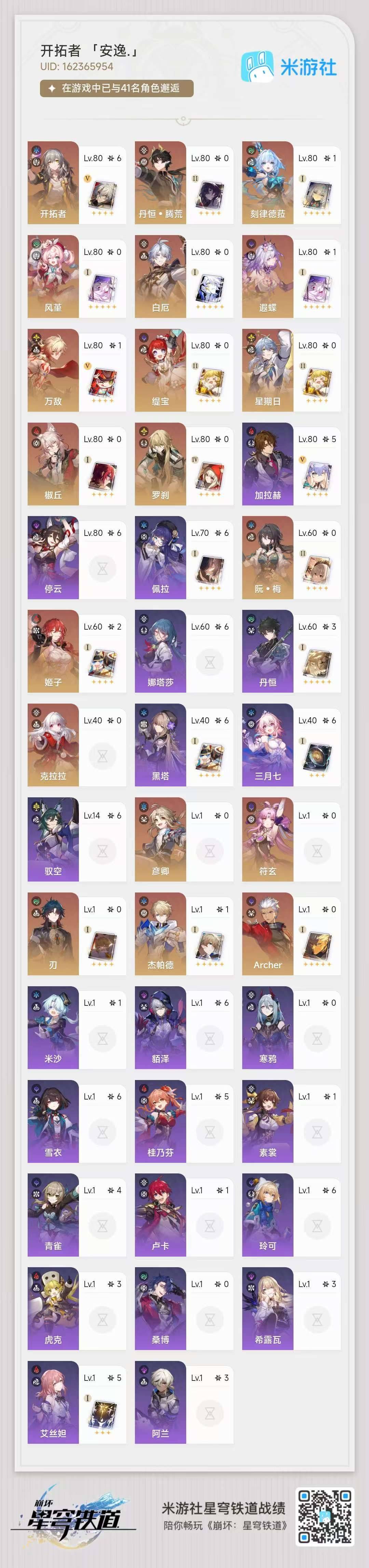 [14375008]【总黄数】:30 【2命金色角色】:2命姬子 【1命金色角色】:1命万敌1命遐蝶1命刻律德菈1命杰帕德 【0命金色角色】:0命椒丘0命星期日0命缇宝0命风堇0命白厄0命archer0命丹恒·腾荒0命彦卿0命克拉拉0命罗刹0命刃0命符玄0命阮•梅 【精5武器】:精5记忆永不落幕 【精1武器】:精1黎明恰如此燃烧精1理想燃烧的地狱精1金血铭刻的时代精1致长夜的星光精1如泥酣眠精1制胜的瞬间精1以世界之名