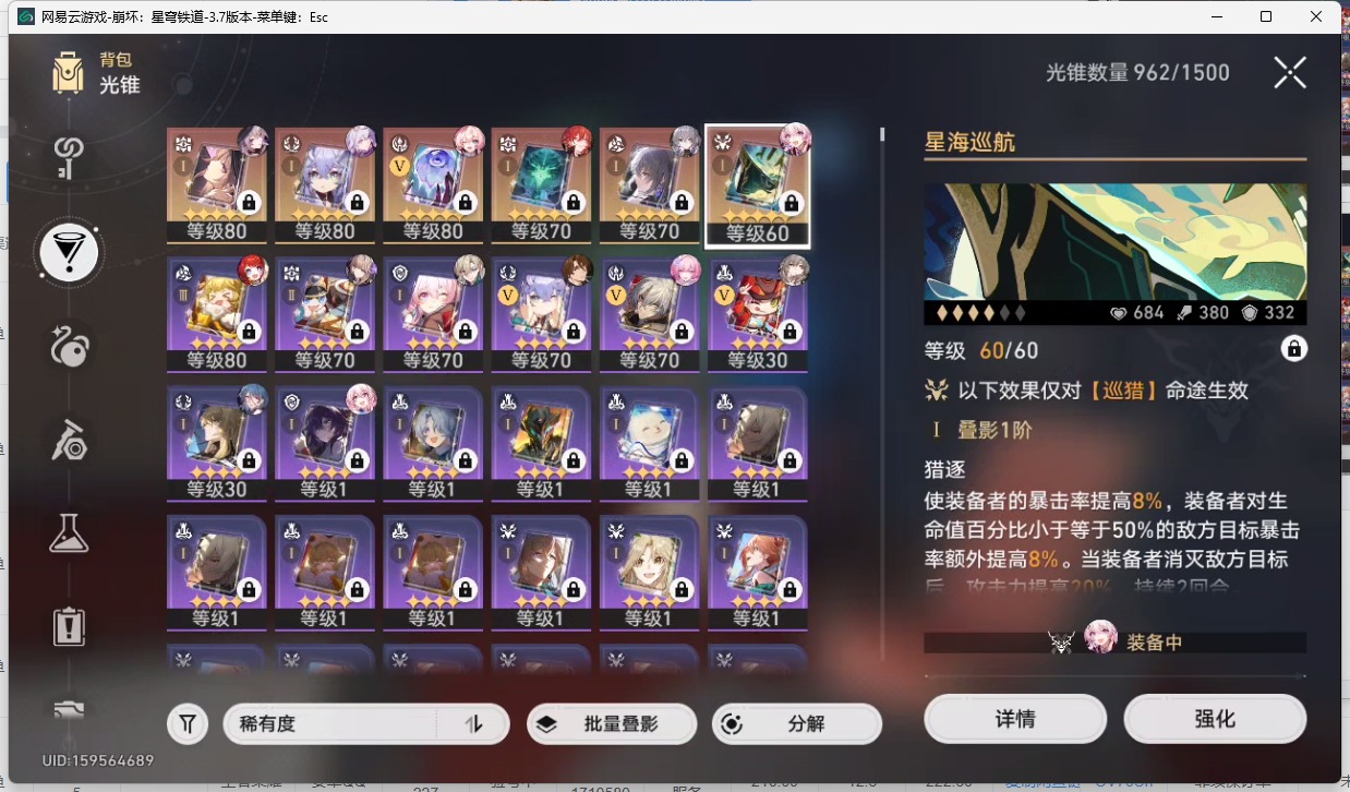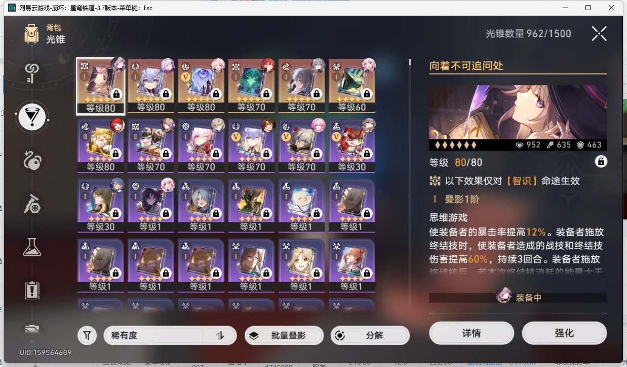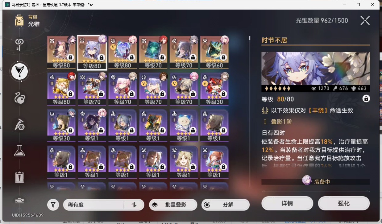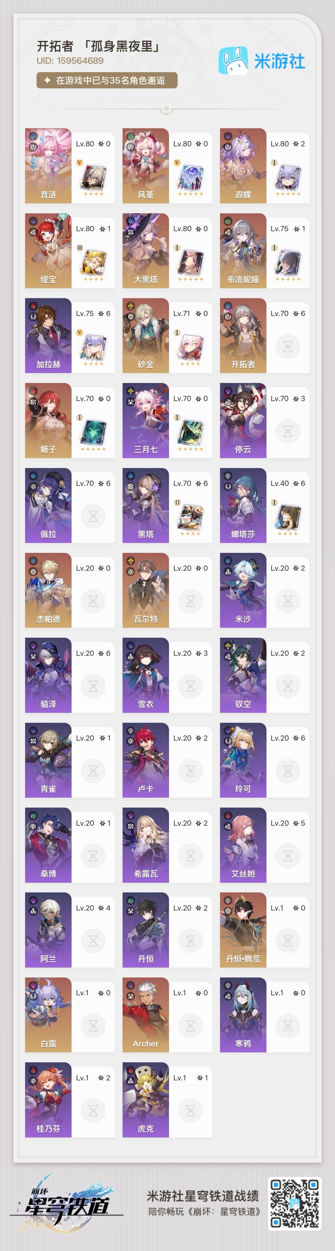 [14377740]【总黄数】:22 【2命金色角色】:2命遐蝶 【1命金色角色】:1命缇宝1命布洛妮娅 【0命金色角色】:0命大黑塔0命风堇0命archer0命丹恒·腾荒0命白露0命姬子0命瓦尔特0命杰帕德0命砂金0命昔涟 【精5武器】:精5记忆永不落幕 【精1武器】:精1不息的演算精1向着不可追问处精1时节不居精1但战斗还未结束精1星海巡航