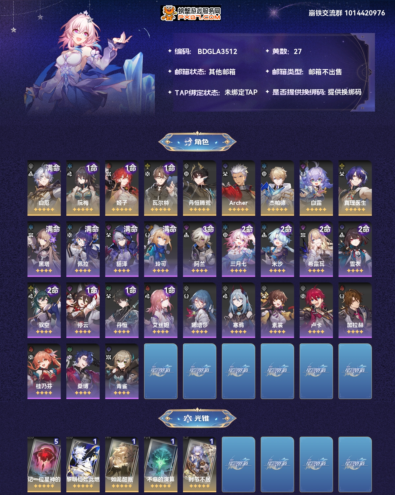 【崩坏·星穹铁道】【lyxq7654】冒险等级:64,女主,五星数量:14,绑定情况:邮箱__五星角色:白厄 6命|阮·梅 1命|姬子 1命|瓦尔特 1命|丹恒·腾荒|archer|杰帕德|白露|真理医生__五星光锥:记一位星神的陨落 5精|黎明恰如此燃烧|如泥酣眠|不息的演算|时节不居,【邮箱不出售】